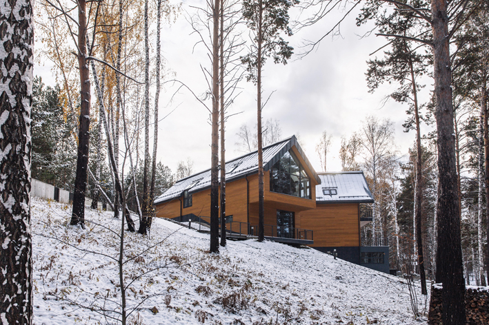 Dit huis is het resultaat van een samenwerking tussen A61architects en YYdesign, beide Russische ondernemingen die met gepaste trots kunnen uitpakken met dit ‘Landform project’. “Het uitgangspunt van dit huis was de dialoog tussen architectuur en het landschap”, aldus de architect. Een huis gevormd door het land waarop het gebouwd is. En laat dit nu net een helling zijn met achteraan uitzicht op de metershoge bomen die een meerwaarde vormen voor de site. De eerder lage voorgevel getuigt van een valse bescheidenheid, want daarachter gaat een zee van ruimte schuil die zich uitstrekt over drie niveaus waarvan een groot deel ondergronds. Door de schuine helling waarop het huis gebouwd is, geeft zelfs de laagste etage uiteindelijk uit op de tuin met terras en is er alles behalve een ‘keldergevoel’. Juist integendeel.