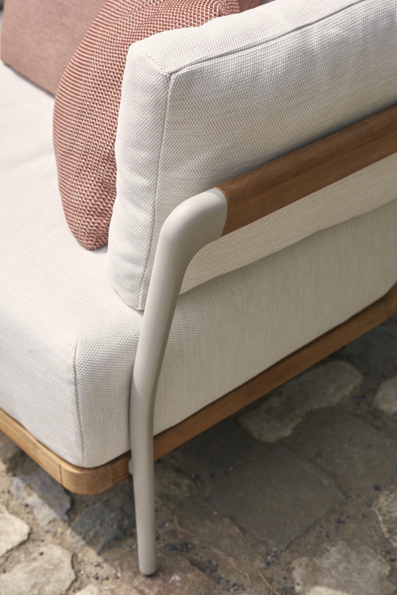 De unieke vormgeving van de aluminium poten geeft de zitbank karakter, maar houdt het geheel luchtig. De collectie is ontworpen door Metrica Design Studio. Robin Rizzini, Chief Designer en Partner bij Metrica: “In plaats van de traditionele cilindervorm kozen we voor een exclusieve vorm die cruciaal is voor de algemene uitstraling van de Flex-zitbank. De cilindervormige basis van de poten evolueert naar afgeronde driehoeken die overgaan in een ovale vorm en aansluiten op de rugleuning.
