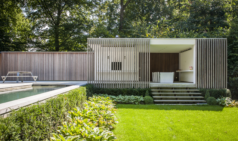 Bij dit project vormen woning, overdekt terras en zwembad één geheel dankzij het doortrekken van materialen en stijl. Een houten scheidingsmuur in afrormosia vormt de verbinding tussen woning en overdekt terras. De houten balken - aan een gedeelte van de voorzijde van het bijgebouw  - ondersteunen de luifel en zijn eveneens in aformosia. De openingen tussen de balken laten het zonlicht naar binnen en vormen een spel van licht en schaduw in de ruimte. Naast hout vormen witte crepi en corian de belangrijkste ingrediënten van dit geslaagde moderne poolhouse. Warme en koude materialen brengen elkaar in evenwicht. Een gedeelte van het gebouw is afgewerkt met witte crepi. Twee schuifdeuren verbergen de toegang tot toilet en kleedkamer en zijn uitgevoerd in corian. Het terras en de vloer in het bijgebouw zijn uitgevoerd in polibeton. Niveauverschillen in de tuin worden opgevangen door het verhoogde zwembad en overdekt terras zodat het bijgebouw op dezelfde hoogte van de woning ligt. Een buitendouche mocht niet ontbreken. Waar kon die beter staan dan net voor een houten wand alweer in afrormosia.