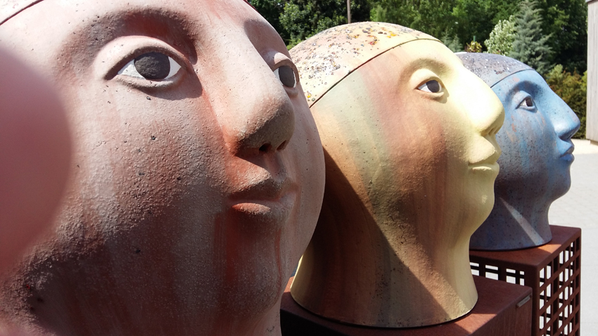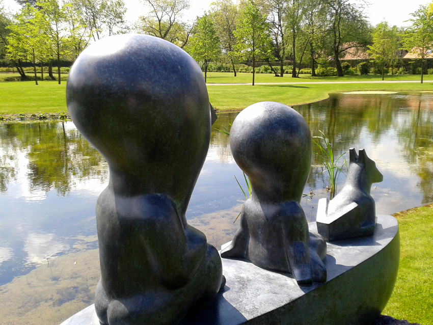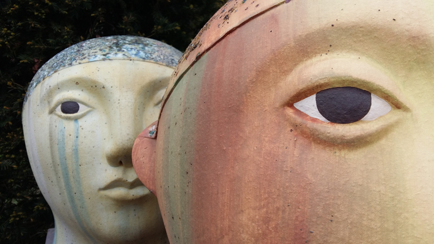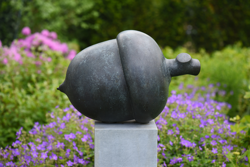 Odiles beelden lijken intrinsiek deel uit te maken van hun omgeving. De majestueuze hoofden in prachtige kleurschakeringen aanschouwen de natuur vanuit hun verstilde pose en genieten van het ‘zijn’. De tuin omarmt de beelden als een cocon waarin ze mijmerend-aanschouwend stroomafwaarts varen. Zonder roeispanen, zich overgevend aan het ritme van de natuur, in harmonie met de elementen. Nóg een reden waarom Odiles wezentjes zo relaxed zijn: ze zijn helemaal in het hier en nu. In hun universum is de tijd gestold en haast irrelevant, zoals de namen zo goed weergeven: Timeless, Time Lost, Time Off, Just Sitting Here, Listening to the Summer Rain, …