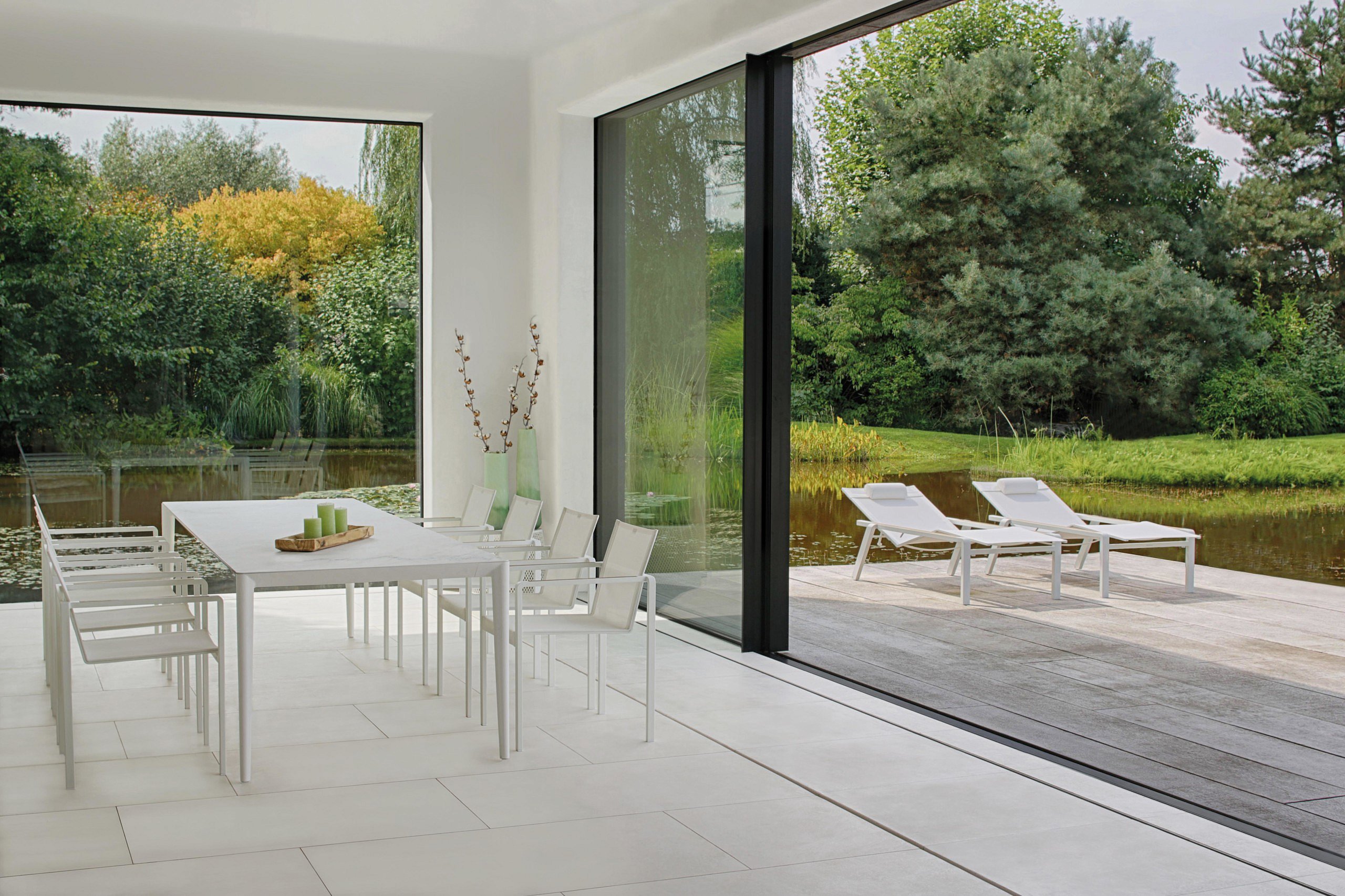 Inderdaad, onze collecties vinden gemakkelijk hun weg naar ruimtes die de grenzen tussen binnen en buiten vervagen. Neem nu JIVE, een stoel voor ‘modernisten’. Naast de bestaande uitvoering in teak, is Jive nu ook beschikbaar in aluminium, in liefst zes kleuren. Een model dat mooi combineert met een eettafel bij een buitenkeuken, of onder een luifel of overkapping. Hetzelfde geldt voor de elegante VITA-stoel: een lust voor het oog en superveelzijdig. Het teakhouten frame wordt gecombineerd met een handgeweven rug en zitting die geen vocht opnemen. De stoelen trotseren dus gemakkelijk regenbuien, maar ze spelen evengoed binnen hun troeven uit.