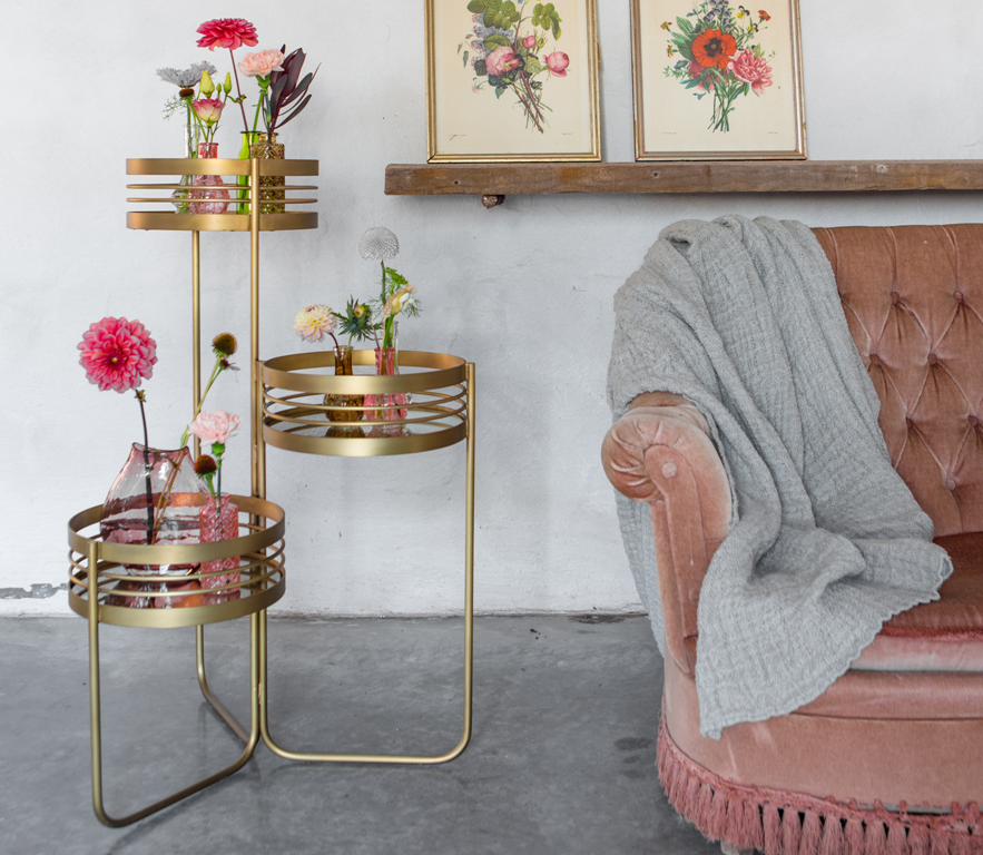 Meer planten, meer vreugde, luidt het mantra tegenwoordig. We hunkeren naar de balans van de natuur dus creëren we onze eigen jungle binnenshuis. En liefst nog in combinatie met enkele mooie vazen. Lifestylemerk Notre Monde neemt het nog een stapje verder: hun plantenhouder ‘Phyllis’ stalt je planten mooi uit op drie levels en hult ze in een gouden jasje. Een luxueuze toets om je urban jungle helemaal af te maken.