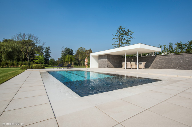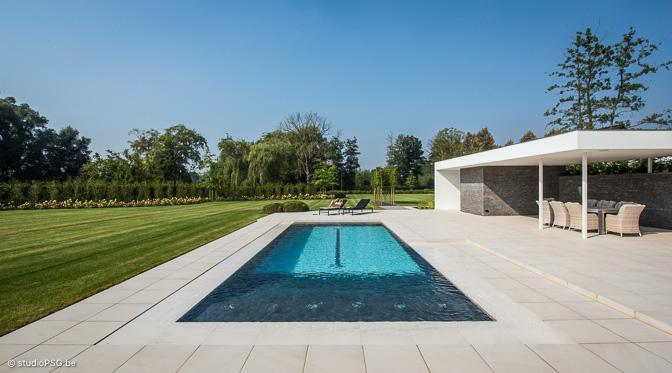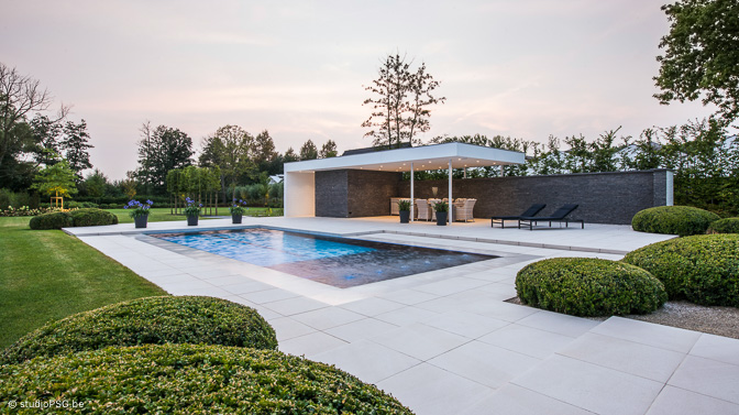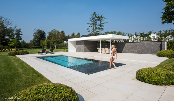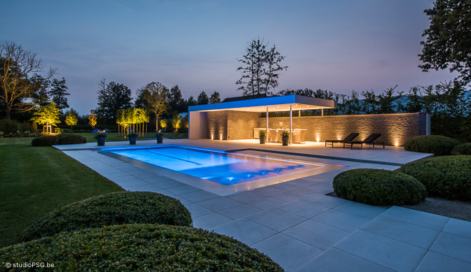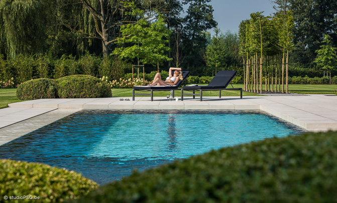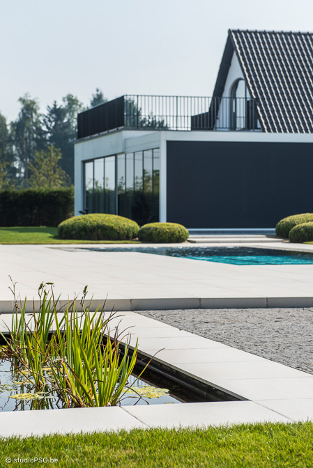 In deze hypermoderne tuin is alles groots, grandioos en oogverblindend. Het hybride zwembad ligt als een azuurblauwe ader in een groen canvas. Het driekwart overloopbad nestelt zich tussen chique Italiaanse tegels (Crema Delicato) die zuiderse sferen oproepen. ’s Avonds zorgt de ingebouwde ledverlichting voor een feeëriek decor.