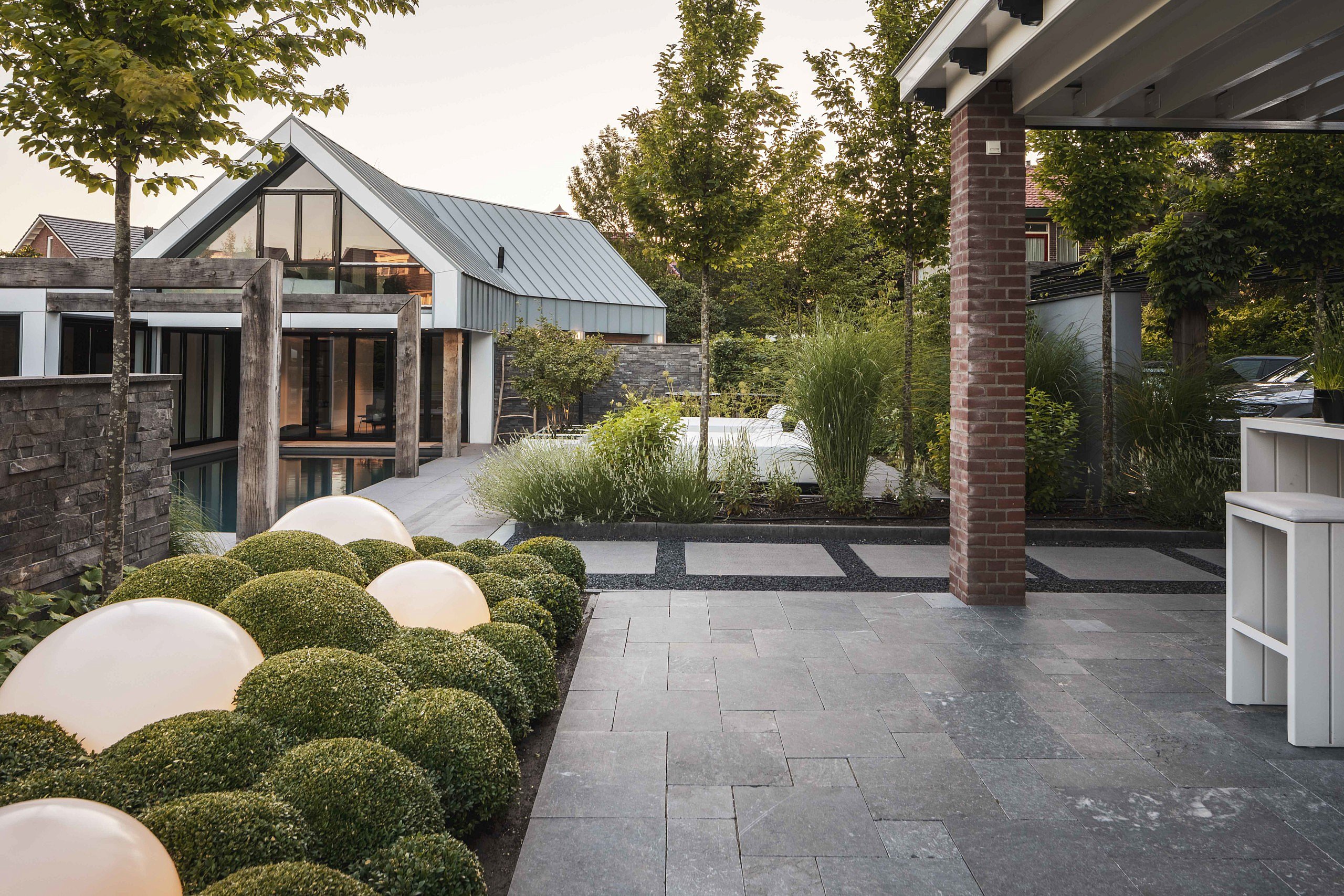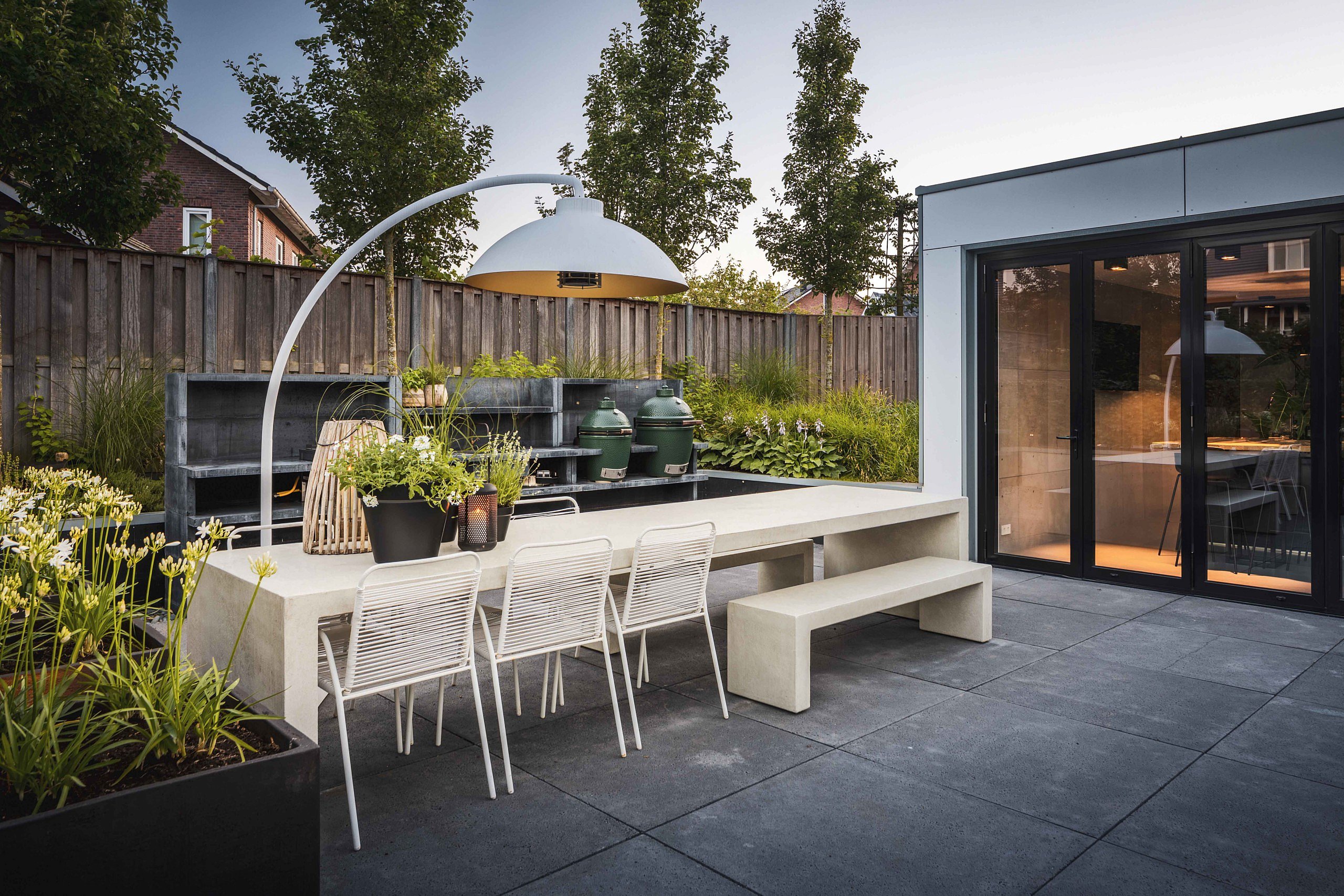 Aan de andere kant van het bad bevindt zich een hypermoderne keuken met eiland dat geïntegreerde spoel- en kookfuncties heeft. De glazen wand schuift volledig open om de grenzen tussen binnen en buiten te vervagen. Op het niet-overdekte terras prijkt een megalange tafel voor zomerse etentjes. Rondom de verschillende lig-, zit- en loungeplekjes werd weelderige beplanting geplaatst in gevarieerde groentinten en texturen. Van buxusbollen met bolvormige Moonlight-lampen ertussen tot zuilvormige hoogstammen, siergrassen, klimplanten en heesters.