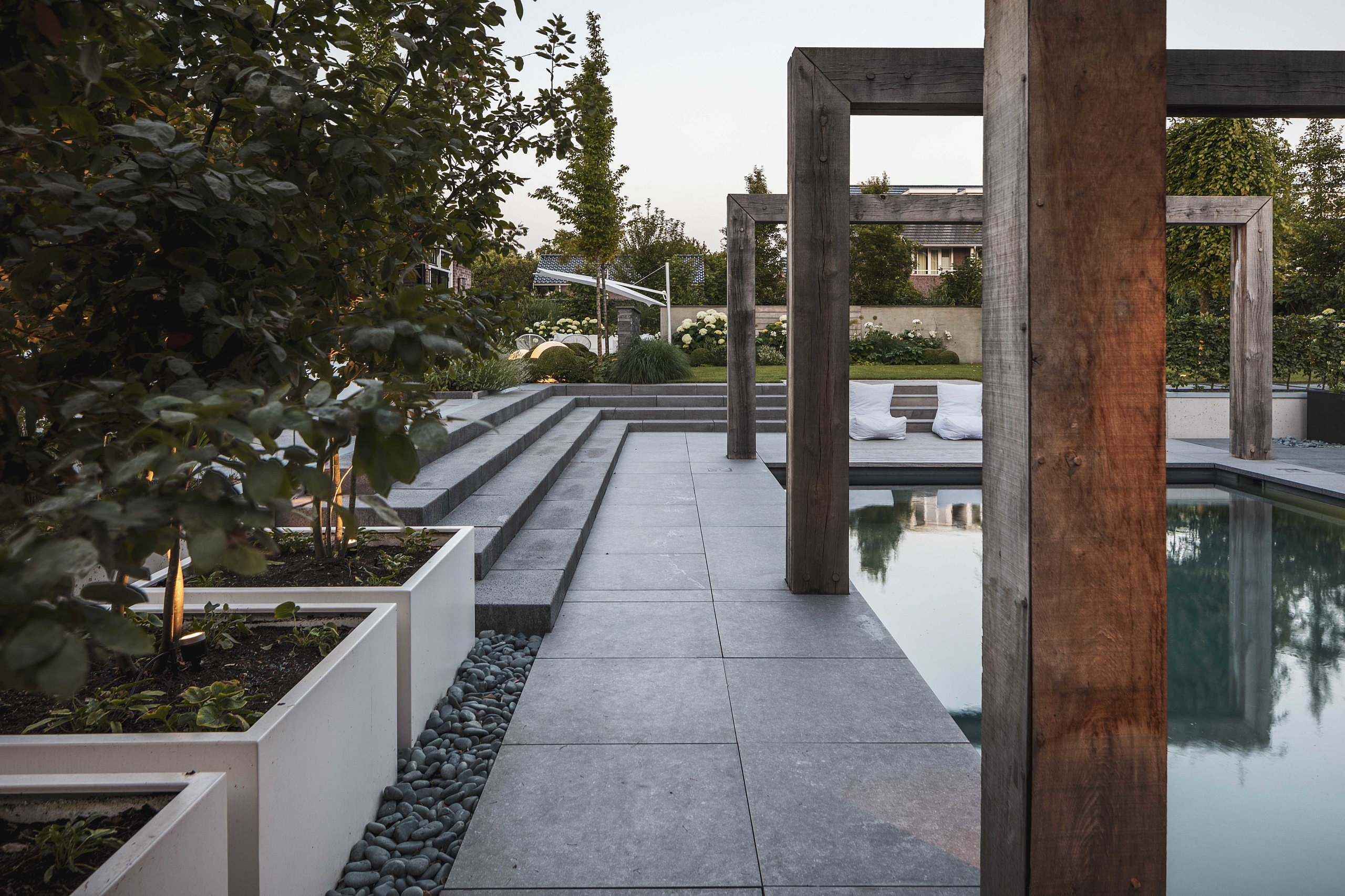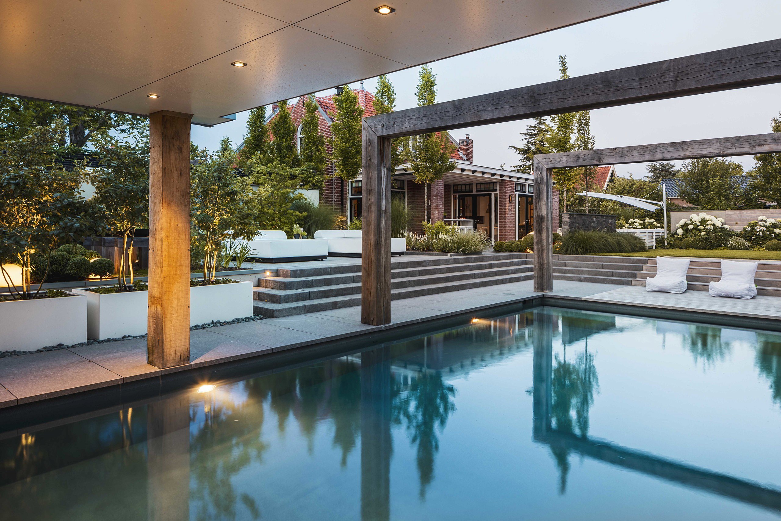Het nieuwe bijgebouw is haast een woning op zich, met (buiten)keuken, sauna, leefruimtes en garage. De kelder biedt onder andere plaats aan de fitness en zwembadtechnieken. In het hedendaagse ontwerp werden warm ogende materialen zoals hout en zink geïntegreerd voor extra sfeer. Blikvanger is het bouwkundige zwembad met eromheen keramische betonlooktegels en een vlonderbaan in hardhout. De grijze coating van het bad onderstreept het gevoel van luxe, en zorgt ervoor dat het versmelt met zijn omgeving. Via antracietkleurige traptreden bereik je het aanpalende zonneterras met oudhollandse Schellevis-bestrating en lederen ligzetels.
