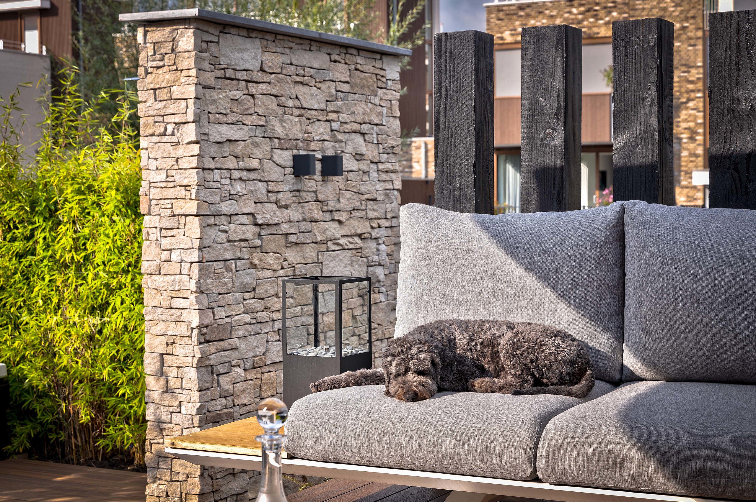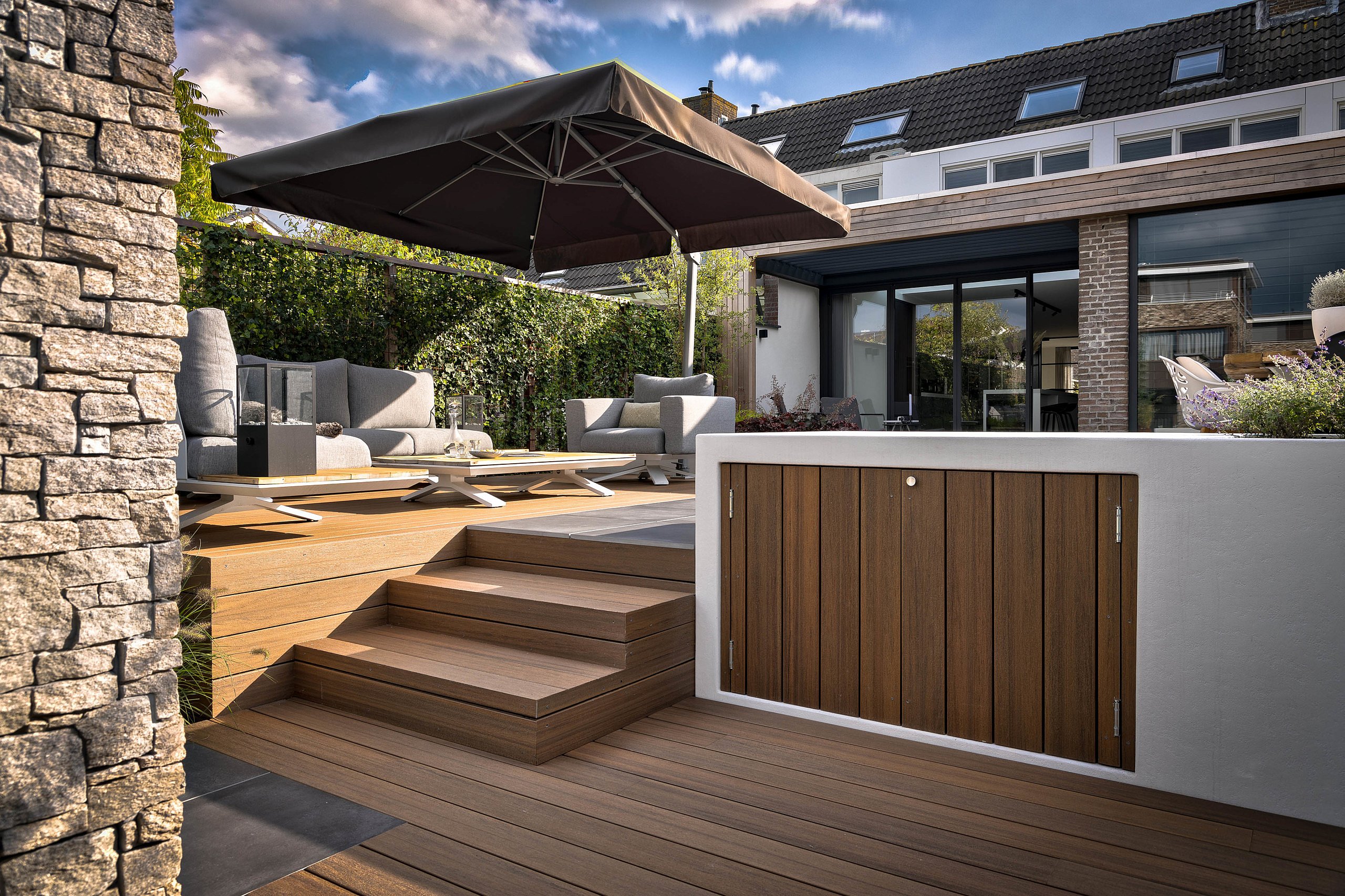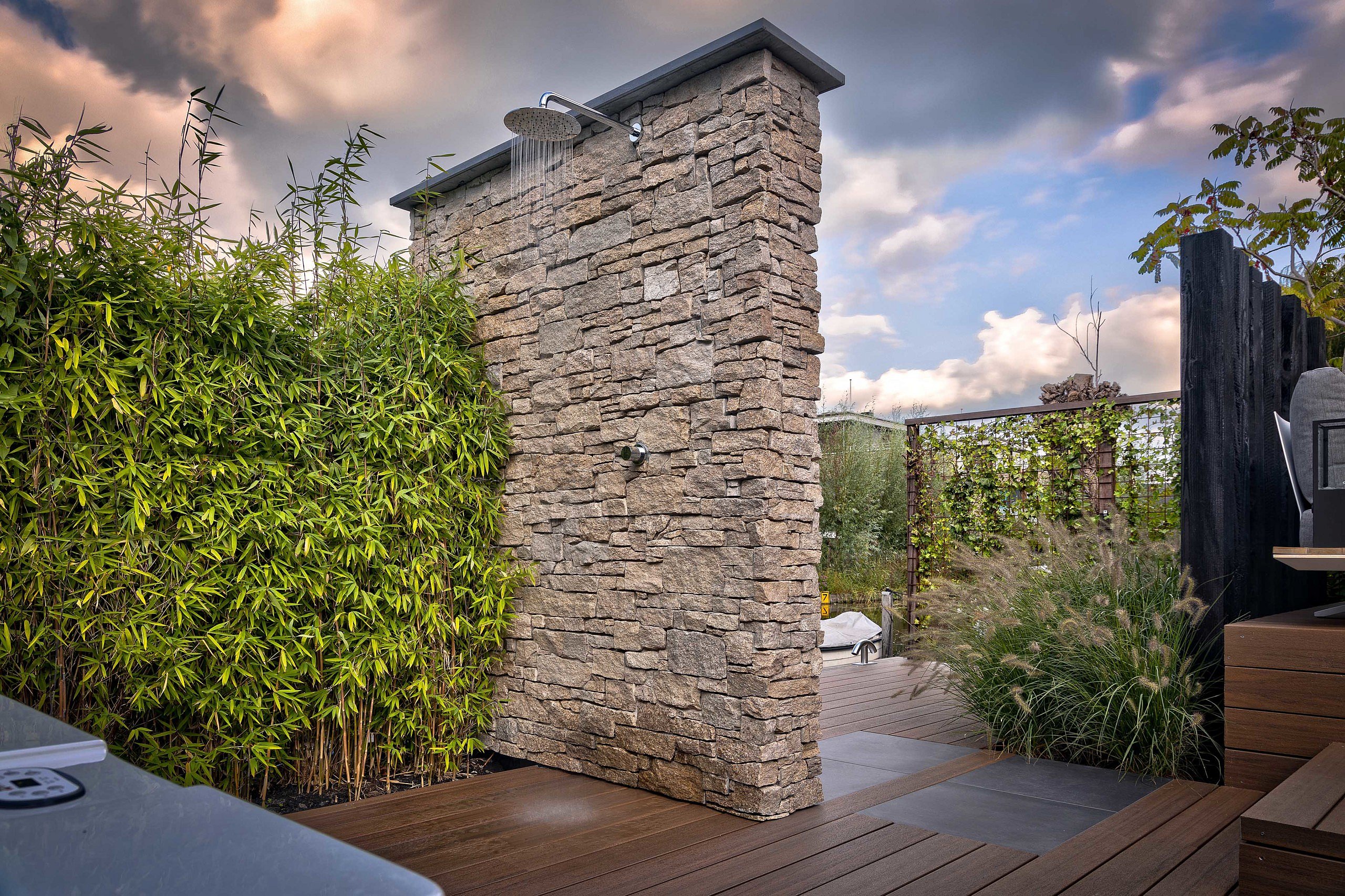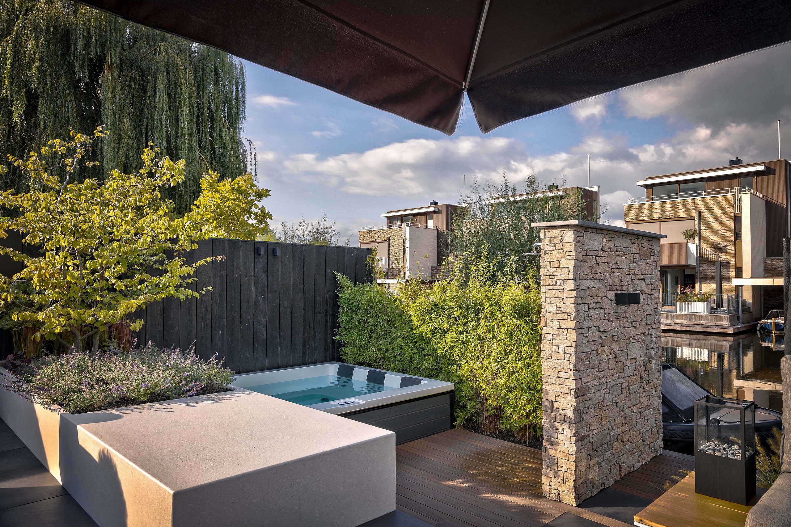 De tuinarchitect is er heel goed in geslaagd om in deze tuin een sfeer van harmonie, warmte en maximale rust te creëren. In zowel het laaggelegen wellnessgedeelte als in de knusse zithoeken kan in alle beslotenheid worden genoten. Bij de verdiepte jacuzzi geeft een hoge en dicht aangeplante bamboehaag, samen met de steenstripsmuur met buitendouche, alle privacy. Leuk detail om te weten is dat de gekozen steenstrips bij de buitendouche helemaal overeenkomen met de wand van steenstrips boven het moderne keukenblad in de woning. Zo wordt de sfeer van binnen naar buiten toe doorgetrokken en andersom. Een originele zwarte palenwand achter de moderne loungebank zorgt voor een afscheiding met het water en zorgt ervoor dat je met je favoriete drankje in de hand in privésferen helemaal onderuit kunt zakken. Bij regenachtig weer kunnen de dikke kussens van de loungebank met alle gemak worden opgeborgen in de speciaal voor deze tuin gemaakte tuinkast. Een witte tuinkast met houten deuren, die een onderdeel is van een grote witte plantenbak en zorgt voor een vloeiende overgang tussen de twee niveaus. Een goed doordachte functionele overbrugging van het hoogteverschil die tevens voor een gevoel van harmonie in het geheel zorgt. Om op de natte dagen ervoor te zorgen dat het regenwater zijn weg naar de aangrenzende sloot kan vinden, zijn in de betonvloer verschillende uitsparingen gemaakt voor plantvakken. Als vulling voor deze vakken is gekozen voor beplanting die enerzijds een warme sfeer geeft aan de tuin, maar die daarnaast ook weinig onderhoud vraagt. Zodra de duisternis invalt draagt de subtiele verlichting van in-lite ook zeker bij aan de sfeerbeleving in deze buitenruimte en maakt het geheel helemaal af.