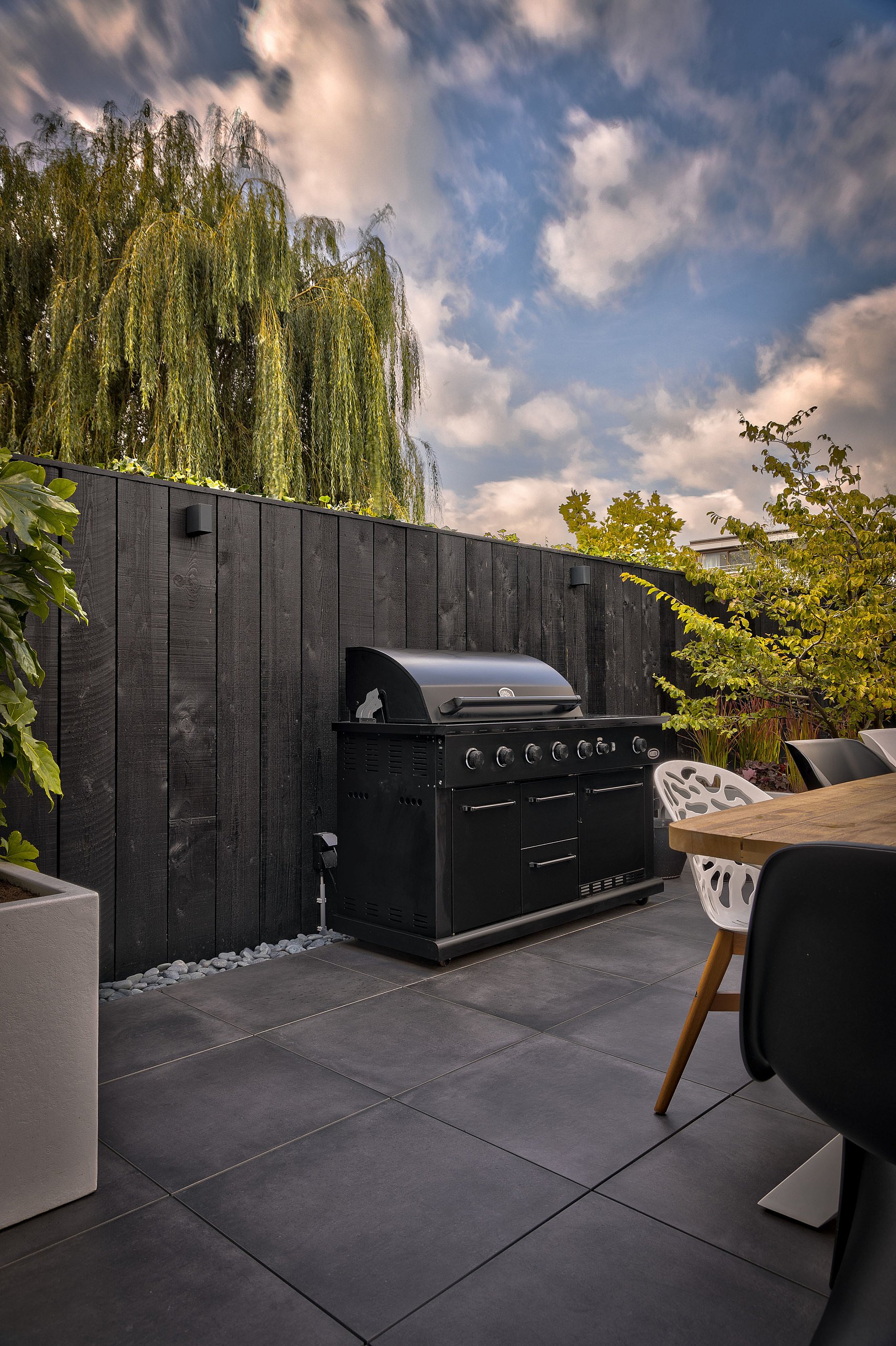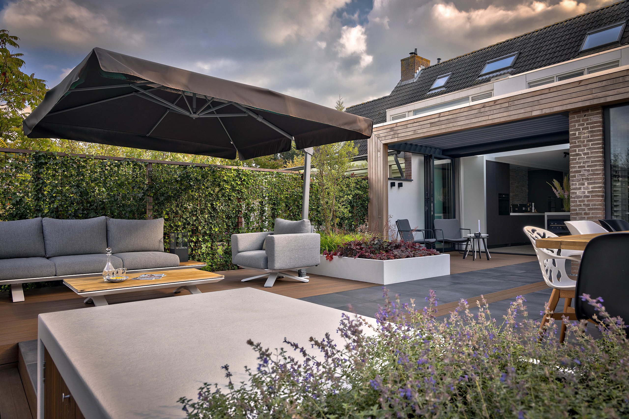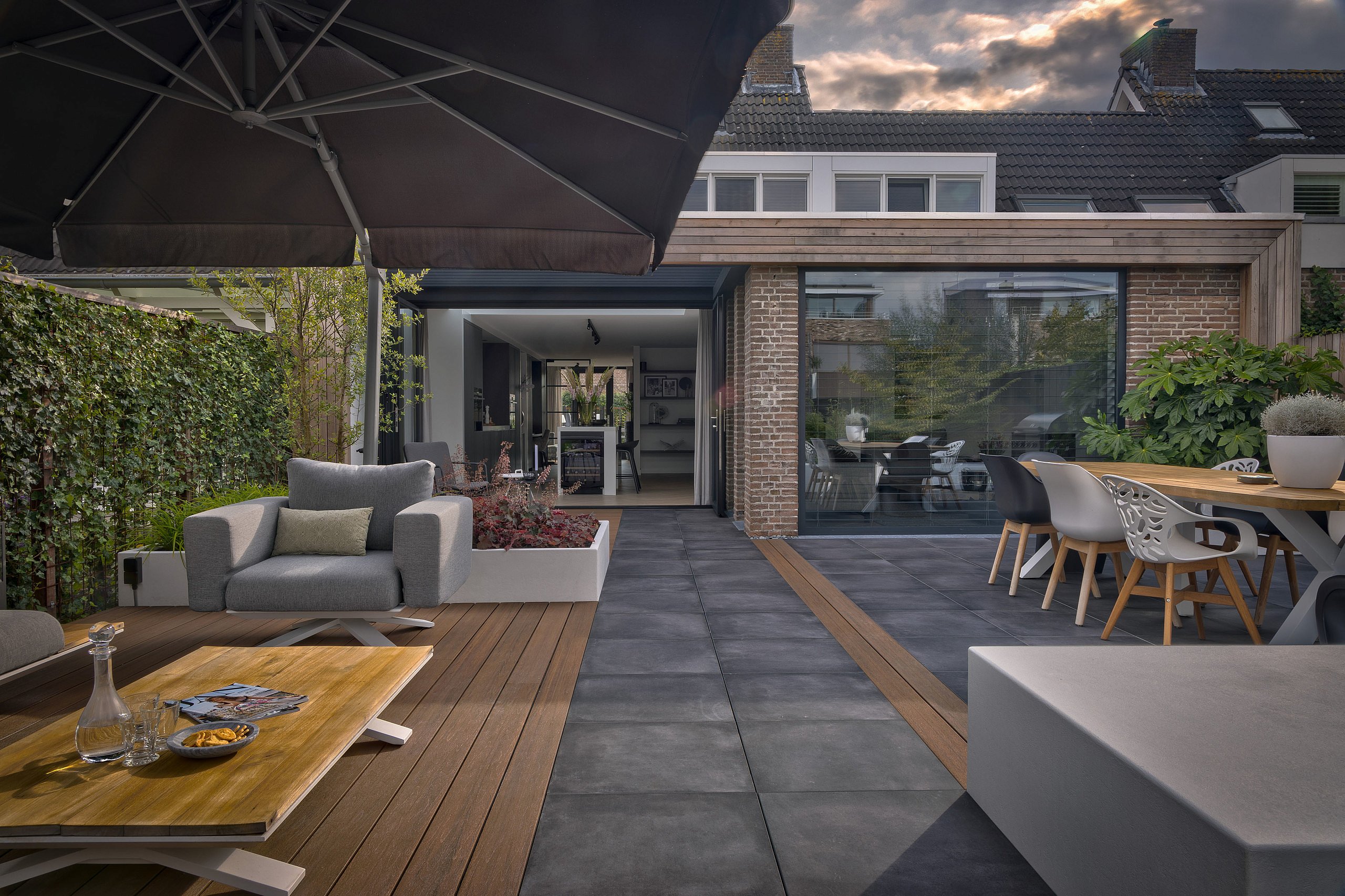 De combinatie van kleuren en de gebruikte materialen zijn zeer zorgvuldig gekozen. De verharding in deze tuin bestaat uit keramische tegels van 60 x 60 cm, welke in drainerend mortel zijn gelegd, en vlonderdelen van composiet. Ook de trap is van dezelfde vlonderdelen gemaakt. Voordeel hiervan is dat de trap niet glad wordt en ook niet verkleurt. Deze verschillende materialen geven ook de verschillende functies weer. Op de vlonder is een comfortabele loungeset met parasol geplaatst en een langgerekt pad van keramische tegels vormt de verbinding tussen de woning en de vlonder bij het water. Het grote tegelterras is ingericht als eethoek met een zwarte buitenkeuken van Boretti.
