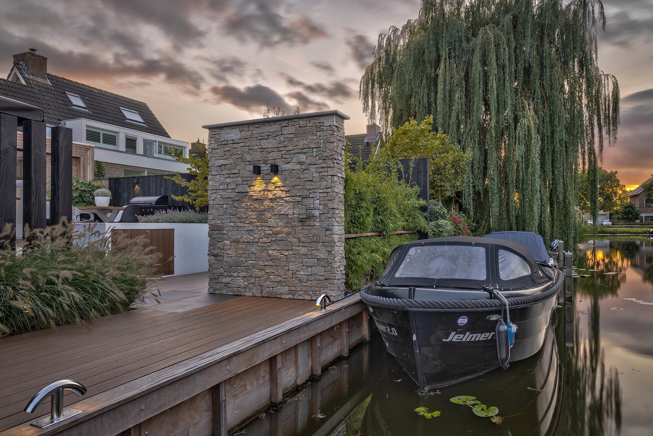 Een belangrijke wens van de bewoners, en groot aandachtspunt voor de ontwerpers, was dat de tuin na een aantal jaren niet zou verzakken. Het waterrijke gebied staat hier namelijk om bekend. De bodem kan flink inklinken wat verzakking van verhardingsoppervlakken en erfafscheidingen kan veroorzaken. Als oplossing hiervoor koos de tuinarchitect voor een fundering op lange houten heipalen met betonnen opleggers. Hierop zijn betonvloeren gestort in twee verschillende tuinniveaus. Daardoor konden op het hoogste niveau twee ruime terrassen aansluitend aan de woning worden gecreëerd. Op het laagste niveau, dat direct aansluit aan het vaarwater, bevindt zich een vlonder met hierop een jacuzzi en buitendouche. De vlonder is een prachtige aanwinst in deze oevertuin. Behalve dat het de tuin groter maakt, dient het tevens als aanlegplaats voor de boot. Dit zorgt voor een vloeiende overgang tussen de tuin, het water en de omgeving en geeft de bewoners de mogelijkheid om vanuit hun eigen tuin de natuur in te varen. Op dit niveau in de tuin is waterpret dus gegarandeerd!