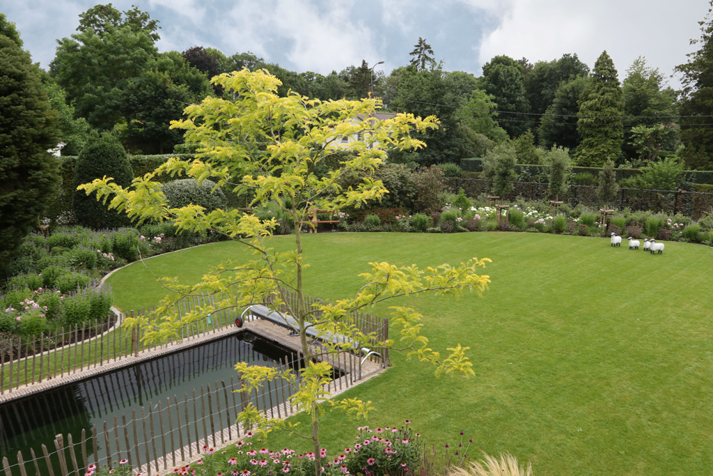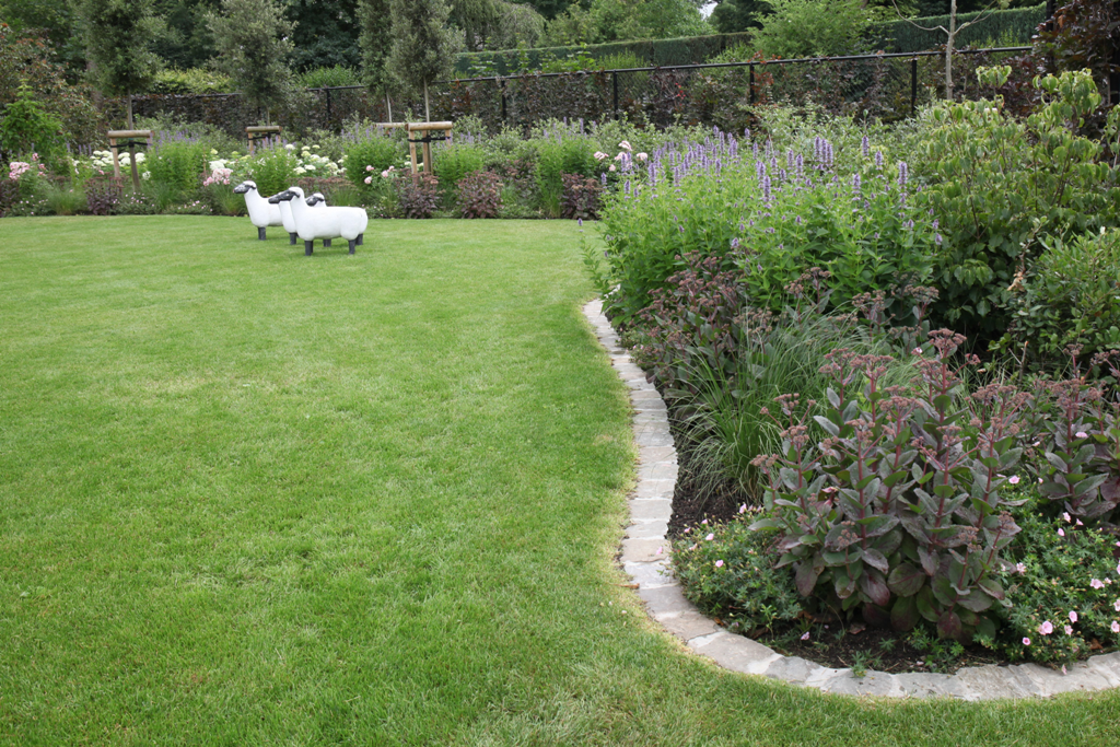 Opdat de borderplanten alle kansen zouden krijgen om te groeien en bloeien, verving Andrew over de ganse tuin 20 cm van de bovenlaag met vruchtbare teelaarde. Ook voegde hij na het aanbrengen van een automatisch druppelsysteem tussen de beplanting verse compost toe. Als blikvanger vinden we tussen het bloeiende grondplan en in de moeraszone enkele sfeervolle kunstwerken.