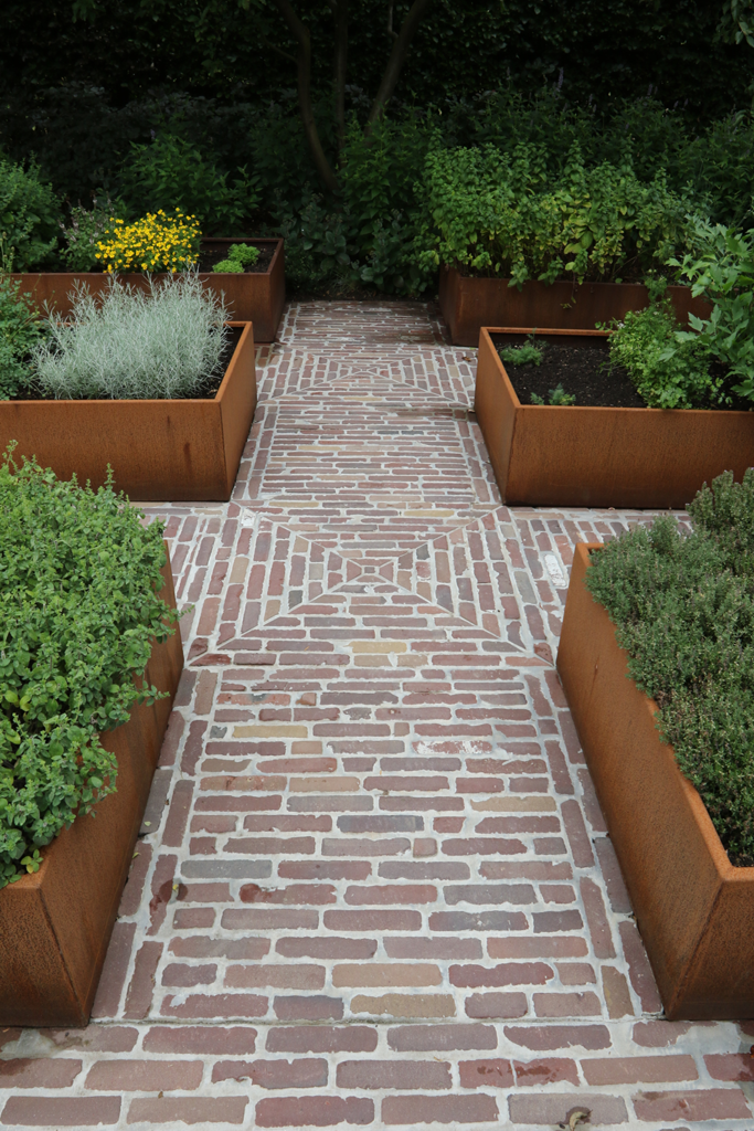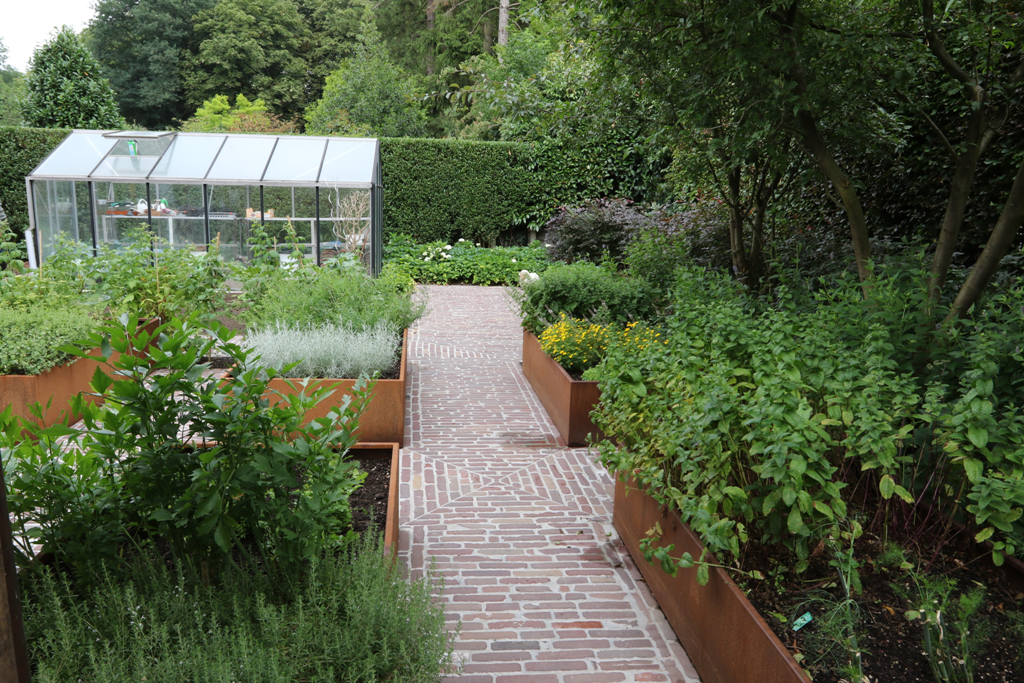 Achter de woning staat een glazen serre en een stemmige groentetuin die in handige hoge cortenstaal bakken zit vervat. Ook een ruime variatie aan kleinfruit en enkele klimplanten vonden hun plaats naast het eetbare groen.