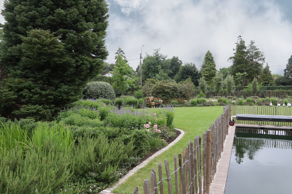 Vlakbij het halfoverdekte terras in blauwe hardsteen beschikken de bewoners over een ruime zwemvijver met natuurlijke filterzone. Andrew omrandde de waterpartij met gehalveerde kleiklinkers. Ook plaatste hij uit veiligheidsoverwegingen een kastanjehouten hekwerk rond het zwemgedeelte.