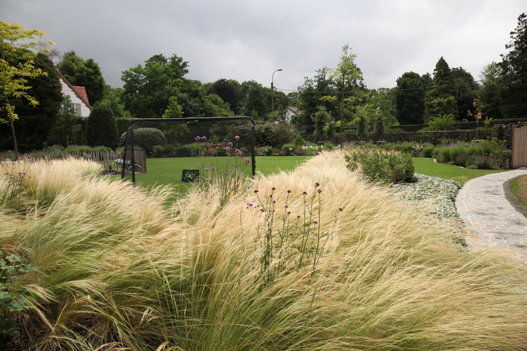 Voor de woning siert een breed golvend gazon dat langszij omvat ligt in bloemrijke borders. De halfhoge beplanting wordt er afgewisseld met siergrassen die nog meer dynamiek aan de voortuin geven. In de hoogte moeten op termijn wintergroene steeneiken het omsloten karakter van de tuin nog meer in de verf zetten.