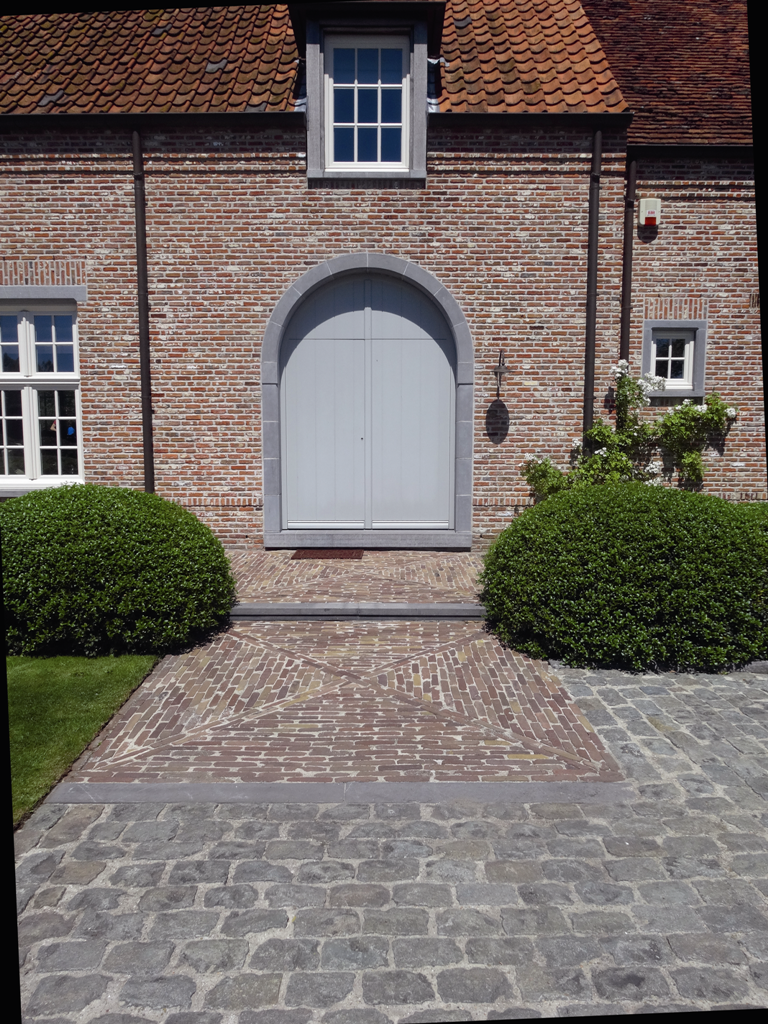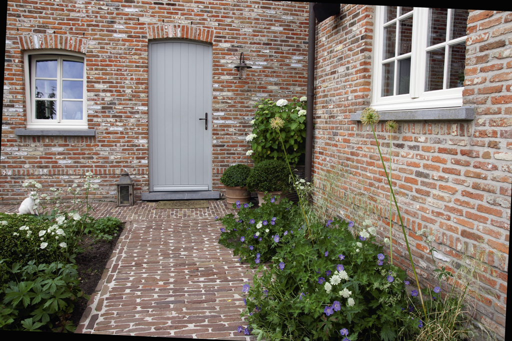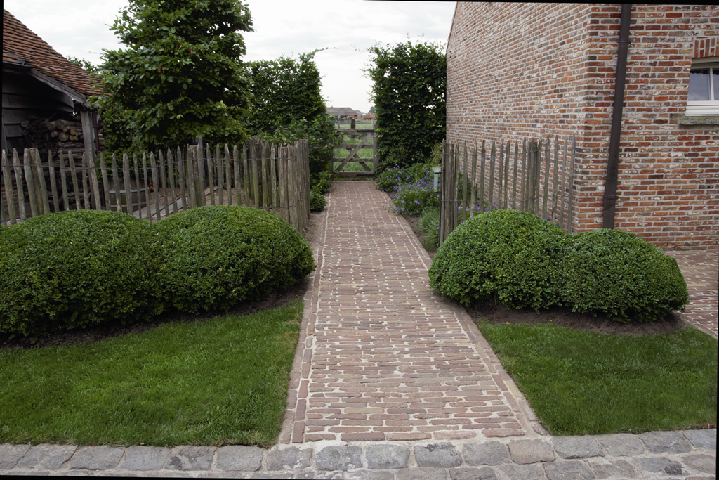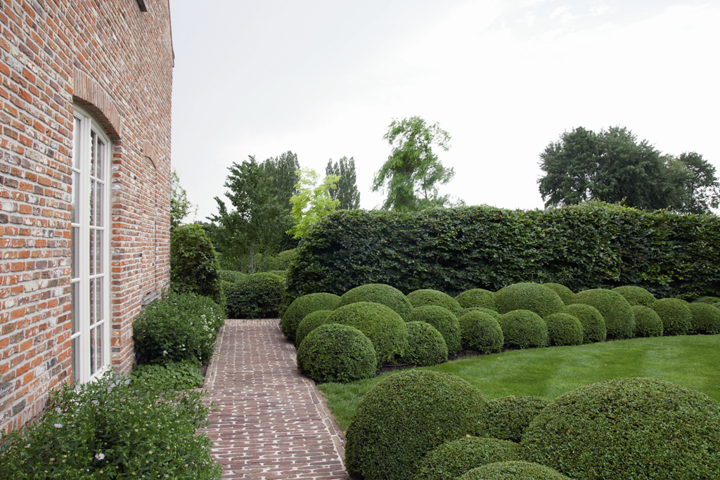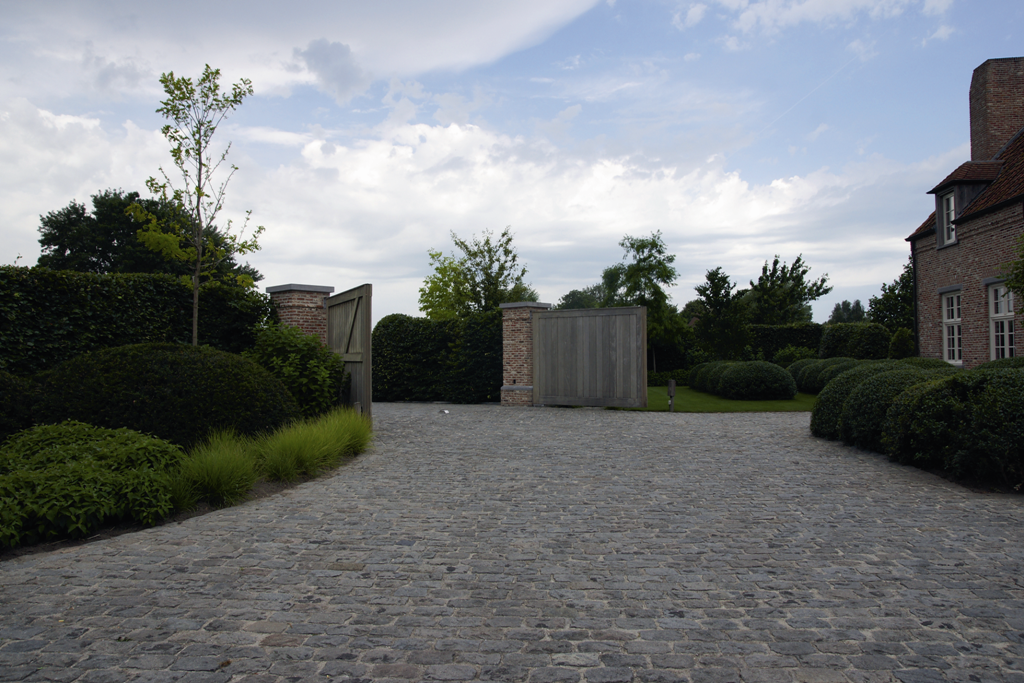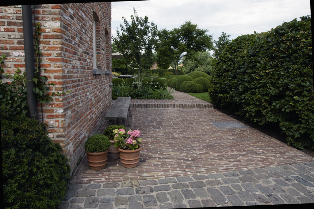 Belangrijk voor de bewoners is dat zowel de garage als de achterliggende stallingen goed bereikbaar zijn. In de voor- en zijtuin neemt de ruime oprit in kasseien dan ook een prominente plaats in. Bart legde zeer vakkundig een kleiklinkerpad tussen wintergroene wolken van buxus, hulst en taxus tot aan de voordeur en laat het dan sierlijk om de woning draaien. Tegen het grasperk aan geven lage en hoge wintergroene hagen structuur en geborgenheid aan de voortuin die Bart verder aanvulde met voorjaarsbloeiers en sierheesters.