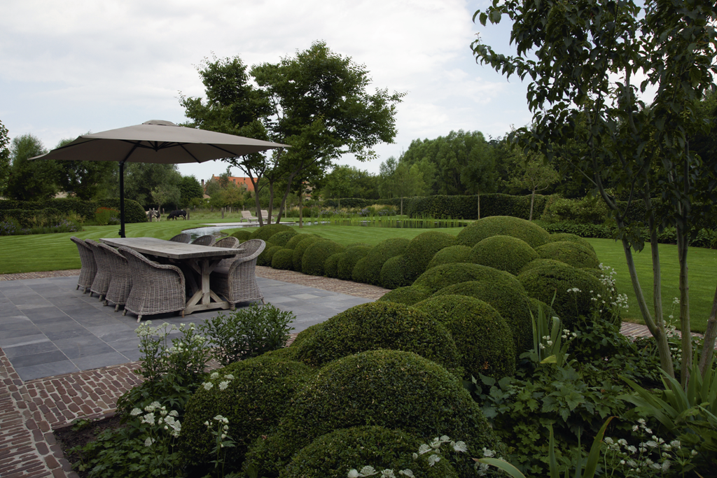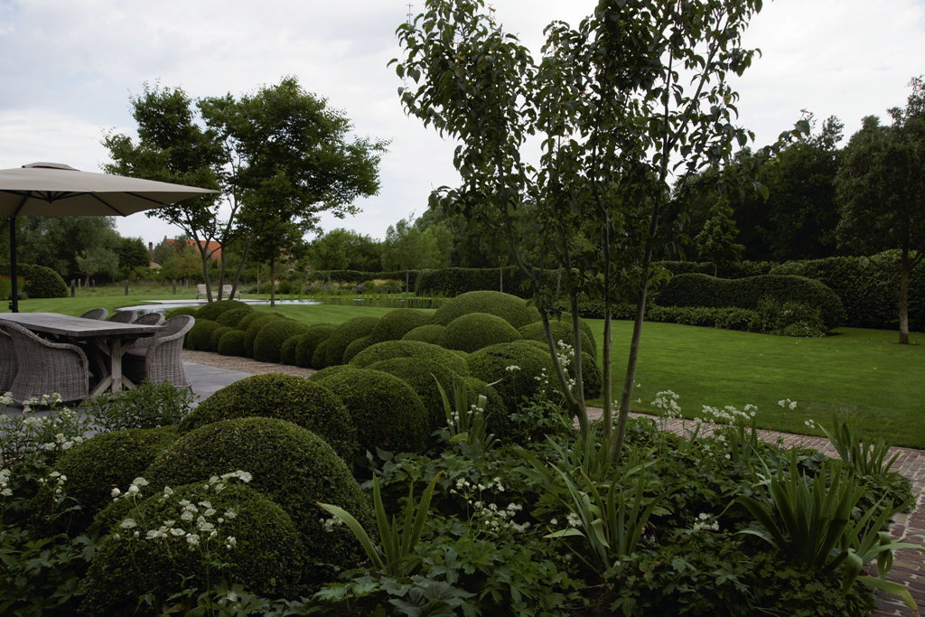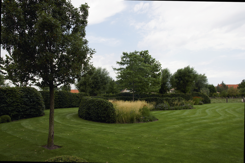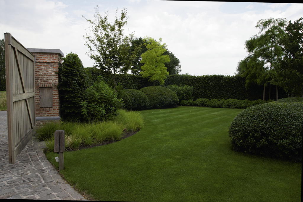 De perfect gesnoeide golvende beukenhagen en lage en hoge borders van siergrassen en heesters geven de tuin een omsloten karakter. Toch liet Bart de eigenaars in zijn ontwerp tal van speelse blikken toe naar de omliggende weides en bossen. Zowel gazon als omliggende beplanting kregen een automatische beregening toegemeten. Subtiel weggewerkt in het groen plaatste Bart ook accent- en sfeerverlichting. Het professionele snoeiwerk en het bijmesten van gazon en beplanting laten de bewoners aan hem over. Bart, op zijn beurt, beloont hen met een piekfijne tuin zodat de bewoners in hun schaarse vrije tijd zorgeloos het hele jaar van het buitenleven kunnen proeven.