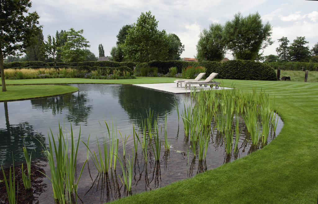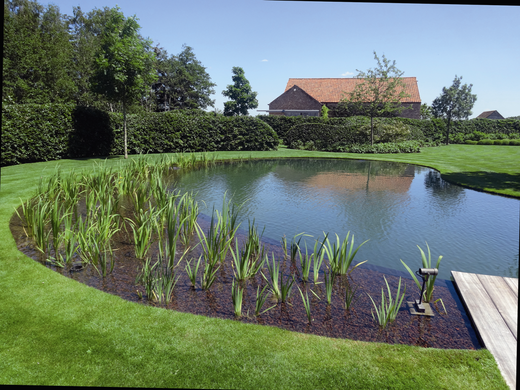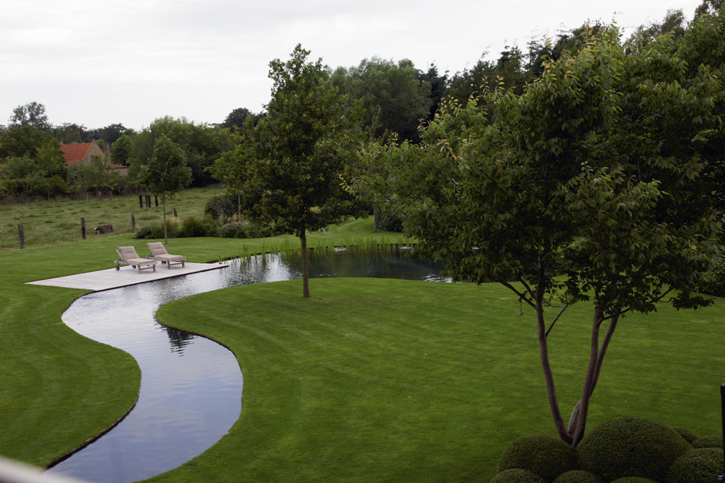 Achter de woning gaf Bart de eigenaars een ruim terras in Belgische blauwe hardsteen met een prachtig zicht op een druppelvormige zwemvijver. Deze geeft tevens een dieper perspectief aan de tuin en nodigt vanop een hardhouten vlonder steeds uit tot een verfrissende duik in het natuurlijke water. Bij de aanleg van de gemetselde en met liner bezette zwemvijver moest Bart rekening houden met een hoge grondwaterstand. Dat loste hij op met een uitgebreid drainagesysteem. In een bocht van de zwemvijver kwijt gele lis (Iris pseudacorus) zich uitstekend van haar taak: het water helder en gezond houden. Door enkele centimeters onder de waterlijn een krachtig ultrasoon toestel te plaatsen gaf Bart ook algen geen kans.