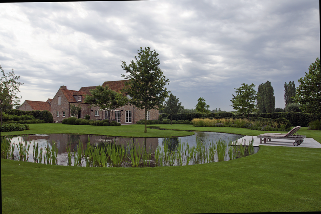 Enkele jaren geleden gingen de eigenaars van een groot perceel in Jabbeke te rade bij tuinaannemer Bart Monbaliu. Hun statige hoeve was al herbouwd, maar miste rondom grandeur en speelsheid. Bart legde hen een tijdloos en oerdegelijk ontwerp voor dat hij kruidde met enkele speelse elementen. De blikvanger in deze tuin is een organisch gevormde zwemvijver die zich tussen de graszoden strekt en plooit.