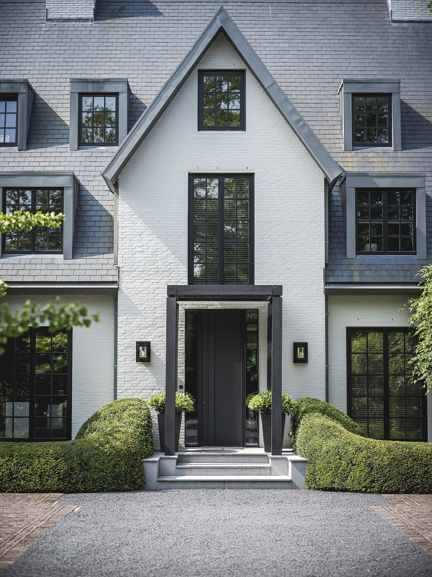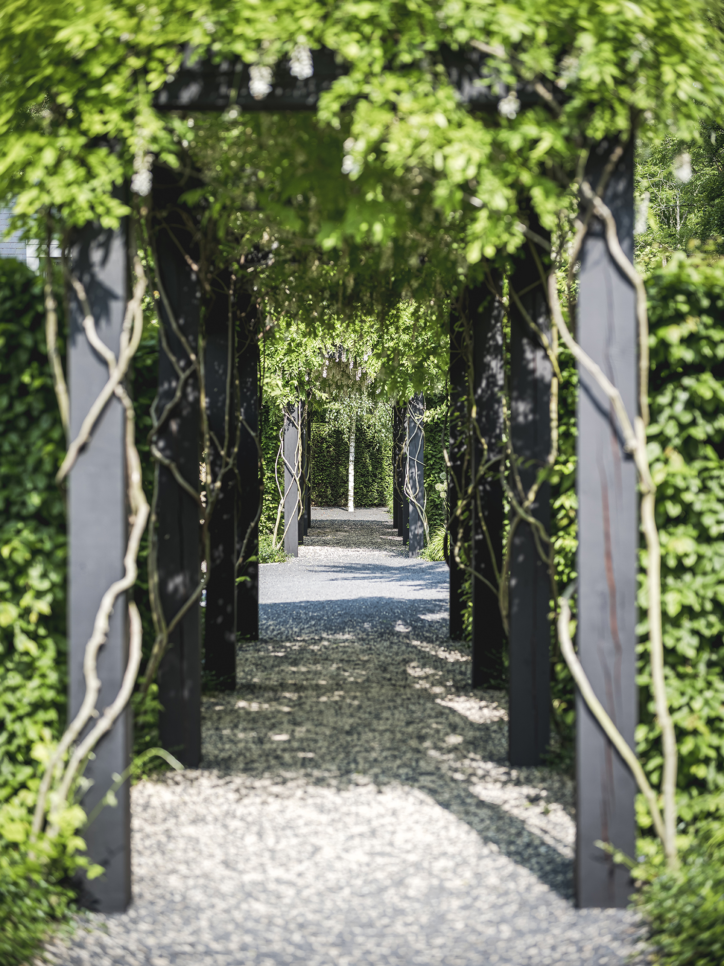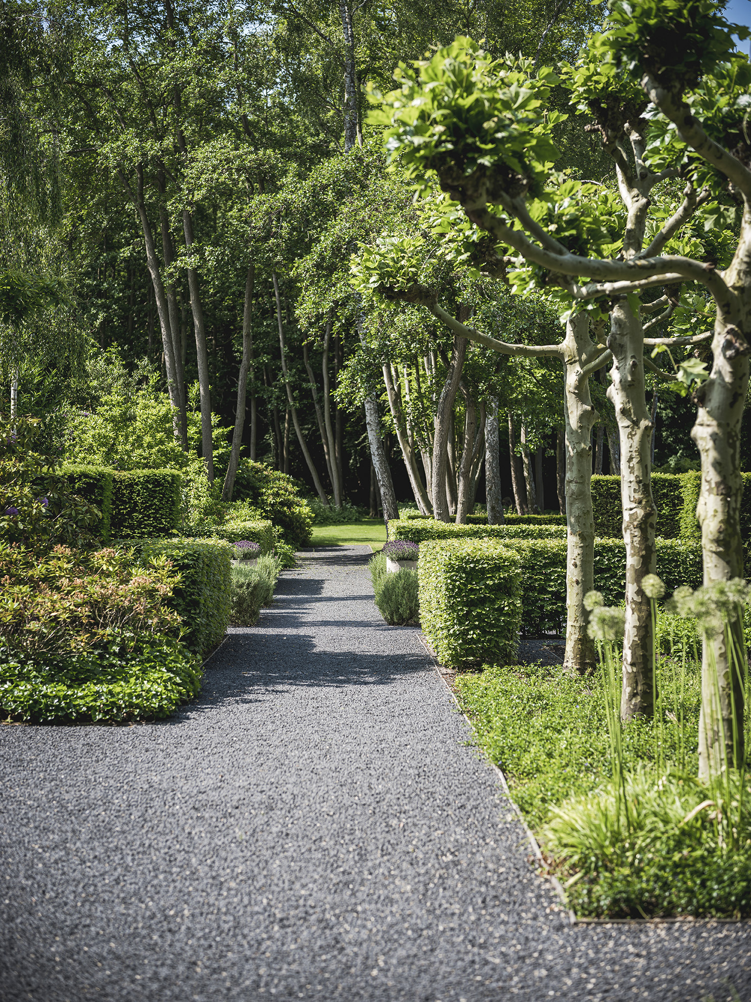 Organische taxusvormen, het zijn net rupsen, omlijsten de trap bij de hoofdentree van de villa en verzachten de strengheid ervan. De kubistisch gesnoeide beukenblokken op stam staan dichter bij de architectuur en zorgen voor het juiste contrast met de ‘rupsen’. De geknotte platanen aan de voorzijde van de villa vormen met hun grillige voorkomen een mooi contrast met de door ons aangebrachte strakke, kubistische pergola. Deze pergola, een vaak voorkomend element in een Wolterinck-tuin, creëert een plek waar natuur en architectuur bij elkaar komen. De blauwe regens omarmen hier de stoere zwarte kolommen die de paden omlijsten.