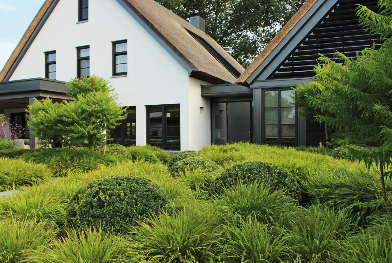 Wat de overige aanplantingen betreft, noteren we nog een groenstrook met heesters. Deze garandeert niet alleen de privacy, maar trakteert de vogels ook op bessen en biedt nestelmogelijkheden. Een rijtje knotwilgen met Groot Hoefblad langs de sloot creëert dan weer een luchtige en landelijke begrenzing van de tuin, geheel in lijn met het concept van de boerderijtuin. Daarnaast zijn er nog de terugkerende wintergroene blokhagen die de tuin verdelen en structuur geven. Er is in deze tuin ruimte voor de grilligheid van de natuur, weliswaar in combinatie met meer architectonische en strakkere elementen. Een harmonieuze symfonie waarin natuur en ontwerp elkaar perfect weten te versterken.