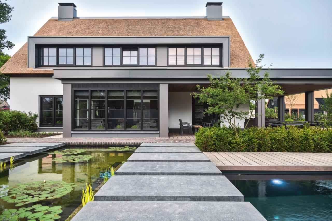 “Al in een vroeg stadium werd ik bij dit project betrokken”, steekt tuinontwerper Peter van der Velden van wal. “Terwijl de bouwkundig architect nog bezig was met het verfijnen van de woningplannen, kon ik al aan de slag met het tuinontwerp.” De synergie tussen beide vakspecialisten resulteerde in een totaalbeeld dat klopt, voor de volle 100 procent. Peter: “Ik zie de tuin als een ‘verbindende’ buitenkamer, tussen wooncomfort en grillige natuur of omgeving. En als er bij het finetunen van de woningplannen ook nog eens rekening gehouden wordt met het tuinontwerp, dan komt dit het resultaat alleen maar ten goede.” Zo werd er, na het bekijken van het virtuele 3D-tuinplan, beslist om extra ramen te voorzien in de woningerker die uitkijkt op de plantenzone van de zwemvijver. Voor een optimale zichtlijn en een nog grotere belevingswaarde, eveneens vanuit de woning van waaruit de bewoners de vier seizoenen in al hun pracht kunnen ervaren. Huis en tuin, voor elkaar gemaakt.