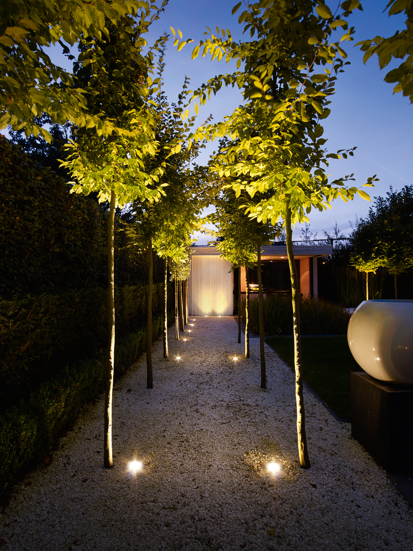 Er is een groot verschil tussen hoe we licht ’s nachts en hoe we het overdag ervaren. ’s Nachts hebben onze ogen in een buitenomgeving minder verlichting nodig om licht, schaduw en patronen te onderscheiden. Een felle spot op je gevel kan wel inbrekers afschrikken, maar schakel je voor een tuinfeestje toch beter uit. Door verschillende soorten verlichting te combineren, krijg je een goede mix tussen sfeer en comfort thuis. Een eigen stukje buiten, hoe klein of groot ook, versterkt het thuisgevoel. We personaliseren dat buitenstukje steeds vaker volgens eigen smaak en trends. Toch geldt ook bij (her)aanleg van een tuin of een boost van je balkon: denk eerst aan de verlichting. Zeker bij een buitenruimte zorgt licht niet alleen voor veiligheid, maar ook voor sfeer. Hoe pak je elke zone van de tuin nu aan? Binnenshuis verlicht je meestal de hele kamer een beetje, dat geldt buitenshuis ook. Voorzie wel minstens een basisspot op terras of balkon. Dat is ook belangrijk voor het veiligheidsgevoel. Functionele verlichting en oriëntatieverlichting ondersteunen op specifieke plaatsen de belangrijke activiteiten. Ze kunnen een pad verlichten of een bepaalde route aangeven, zoals spotjes langs een zwembad of de oprit. De sfeerschepper bij uitstek: gebruik gericht licht, bijvoorbeeld om een boom of object te accentueren.