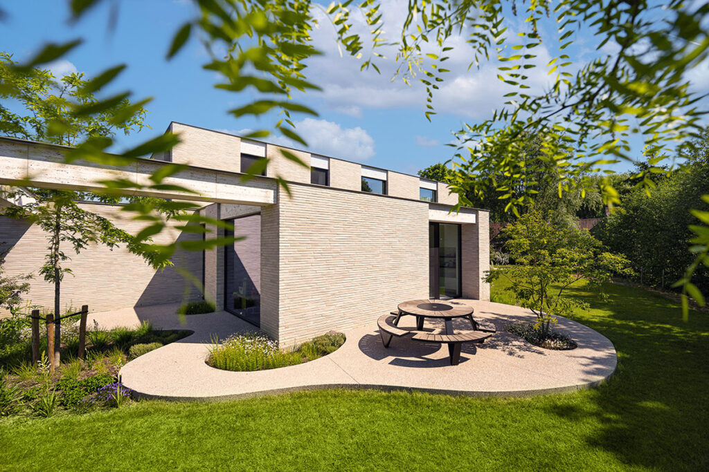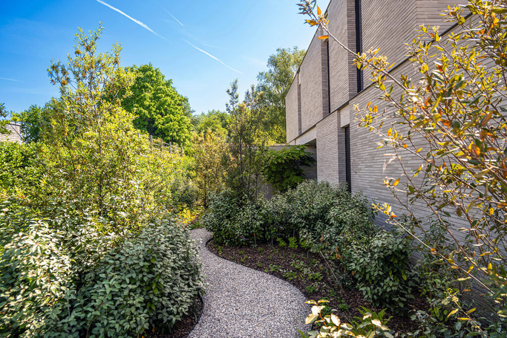 Het is een beetje atypisch voor een strakke nieuwbouwvilla, maar de architect wilde juist dat de architectuur níét met alle aandacht zou gaan lopen. Om de woning zo naadloos mogelijk in de omgeving te laten opgaan, koos hij voor neutrale beige- en zandtinten die het groen rondom extra doen stralen. “De weinige organisch aangelegde verharding die er is – zowel het uitgewassen beton als de Franse dolomiet – heb ik bewust in dezelfde tinten toegepast. Huis en tuin worden zo nog meer één”, vertelt tuinarchitect Sébastien Decock van Tuinen Decock. “De architect heeft het zelfs aangedurfd om een open aanbouw met een ‘brugje’ te creëren, waardoor een patio ontstond met een prachtige Gleditsia (valse christusdoorn) als blikvanger. De open kruin ervan zorgt ervoor dat je binnen ruim voldoende daglicht hebt.”