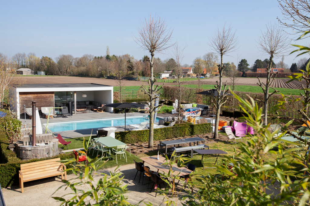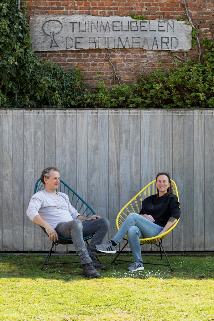 De helft van de collectie van De Boomgaard staat uitgestald in de tuin. In het groen van het landelijke Heerle bewijzen de meubelen hun duurzaamheid, onderhoudsvriendelijkheid en kwaliteit. “Het is in dit ’testlabo’ dat het kaf van het koren gescheiden wordt”, verzekeren de zaakvoerders, die op hun prachtige locatie een belevingsfactor toevoegen.