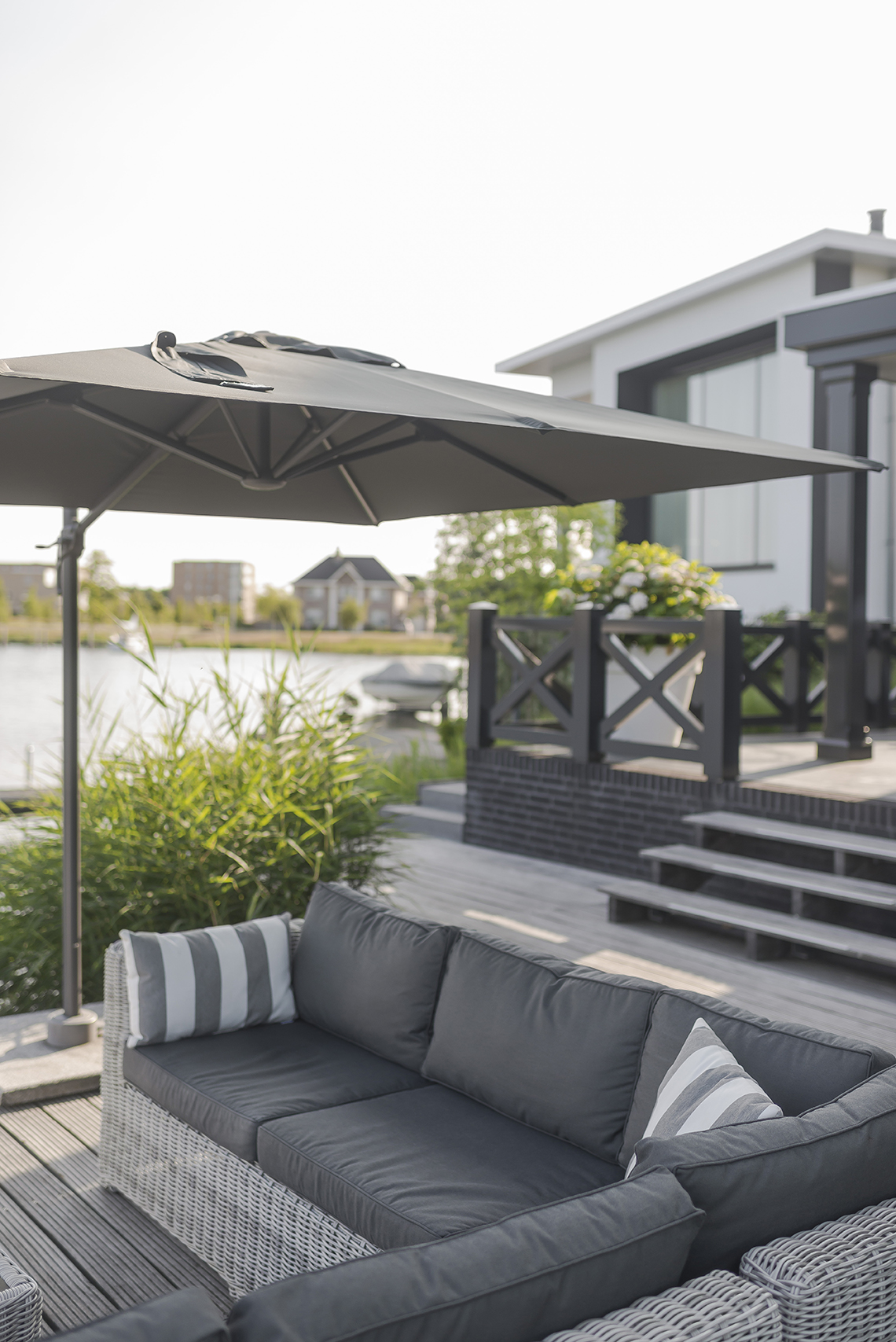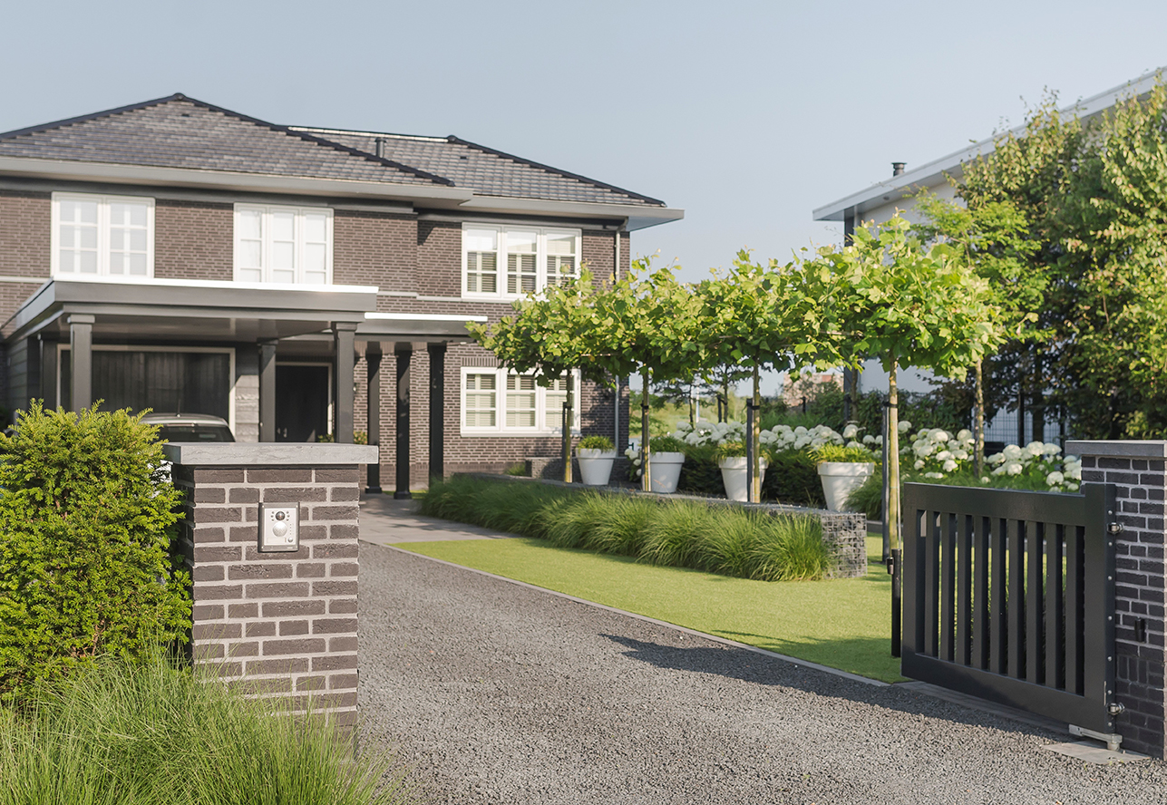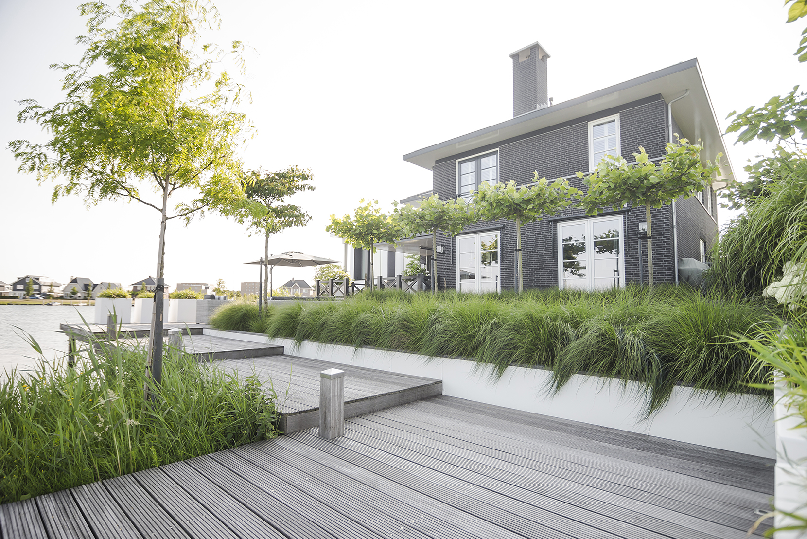 In de tuin zijn diverse zitgelegenheden gecreëerd, die de bewoners de mogelijkheid geven om op verschillende plekken van de tuin te genieten: dichtbij de woning of juist dichtbij het water – het is beide mogelijk. Voor wat betreft de materialen is bewust voor een sobere uitstraling gekozen, zodat de niveauverschillen en detaillering goed tot hun recht komen. Antraciet-, grijs-, wit- en aardetinten wisselen elkaar af. Gerjan Hofman van BUYTENGEWOON HOVENIER tekende voor de volledige aanleg van de tuin. Het is wat iedere opdrachtgever eigenlijk wil: een stijlvol tuinontwerp, kwalitatief hoogstaande tuinaanleg, één aanspreekpunt in het gehele proces en na oplevering verzekerd zijn van gedegen tuinonderhoud.