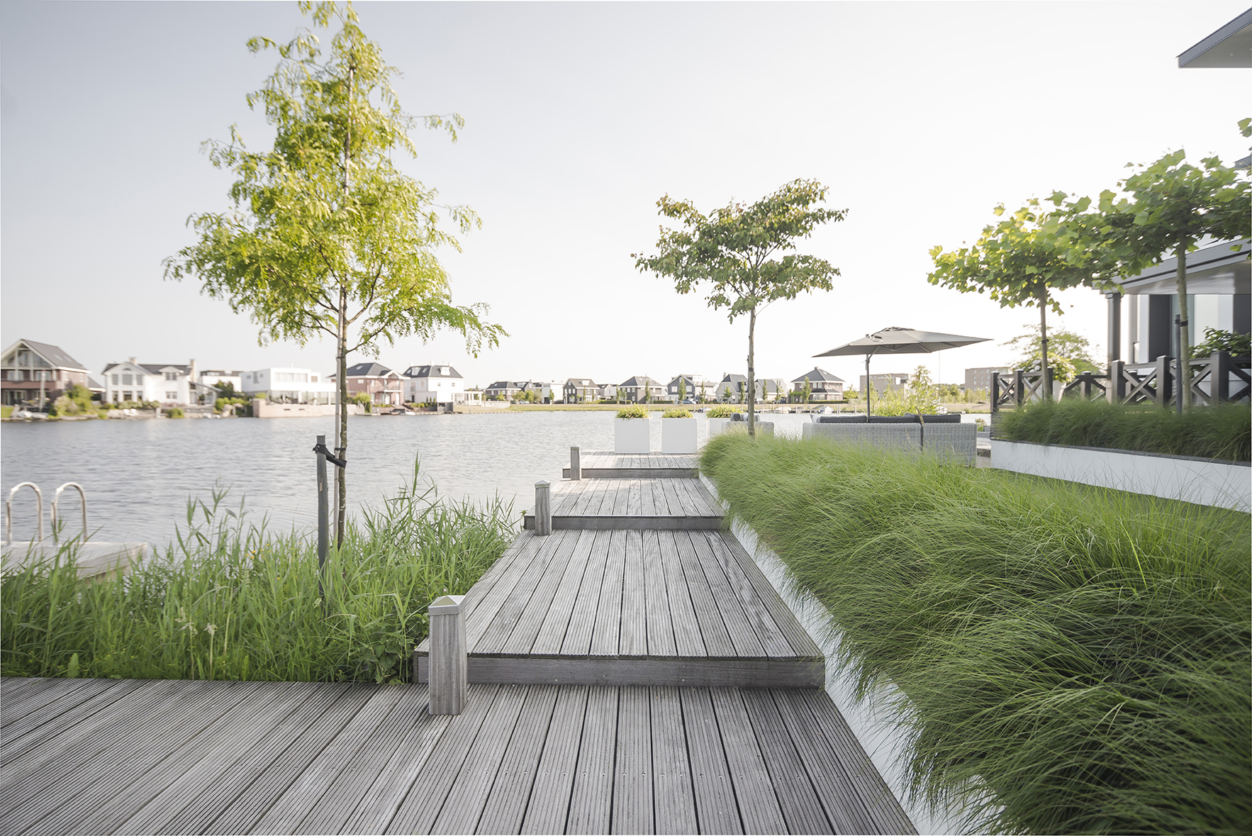De ontwerper stond voor een grote uitdaging: tussen de niveaus van de achterzijde van de woning en het waterpeil bestond een behoorlijk verschil. Dit niveauverschil heeft in het tuinontwerp echter juist de hoofdrol gekregen. De diverse niveaus zijn zo vormgegeven dat zij het lijnenspel in de tuin versterken, zonder dat het ten koste gaat van de ruimtelijkheid. Blikvanger is de houten loper, die naar de aanlegsteiger voor de boot leidt. Door middel van ritmisch geplaatste houten plateaus heeft de loop naar het water een zeer chique uitstraling gekregen.