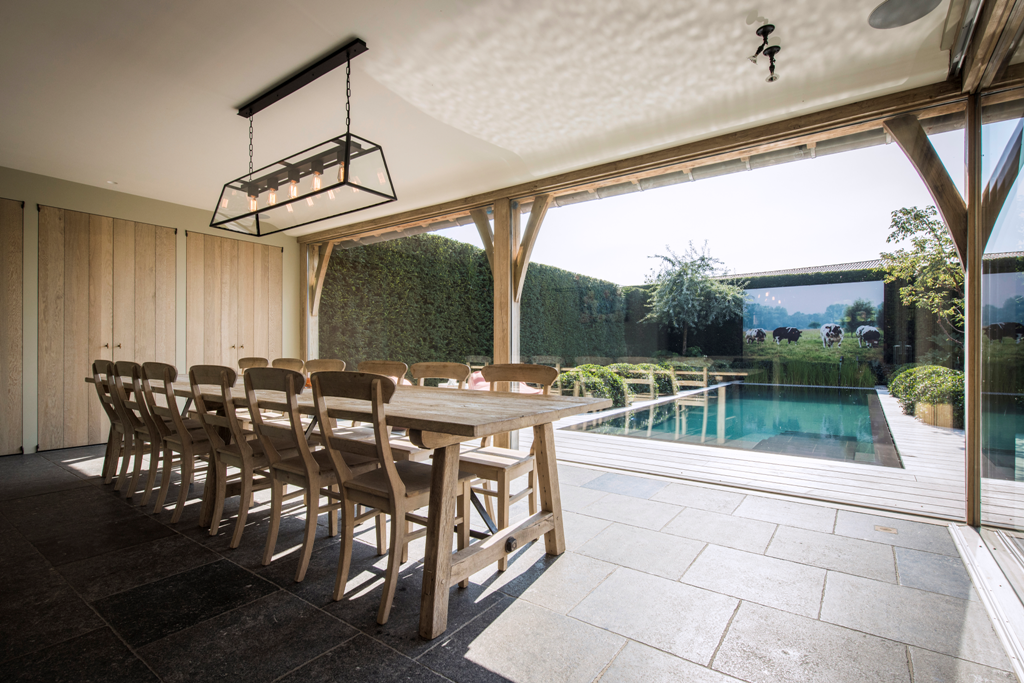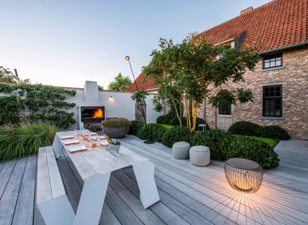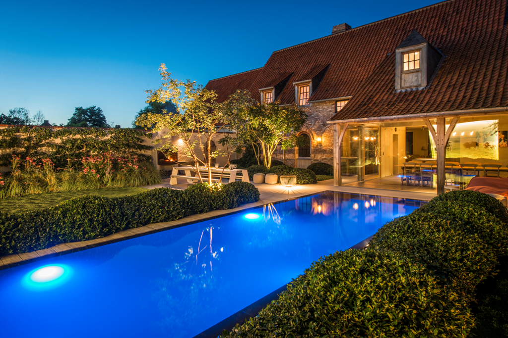 Wat iedereen natuurlijk meteen opvalt, al vanuit de woonkamer, is de fotowand van Barts grote liefde die een prominente rol in het ontwerp kreeg. Zijn werk en gezin komen niet op de tweede plaats, maar toch gaf Bart het Belgische witblauwe runderras een speciale plek in zijn hart en in zijn tuin. Met subtiele ledstrips kan deze fotowand sfeervol worden opgelicht. De tuin herbergt nog andere lichtpunten die verscholen zitten in de gevarieerde beplanting. Zo krijgt elke zomeravond een diepere, sfeervolle dimensie. Wie zich als klant hier nestelt aan tafel of in een van de loungezetels, kan enkel denken: ‘Bart, dit gevoel van vakantie en vrijheid staat ook bovenaan op mijn verlanglijstje!’
