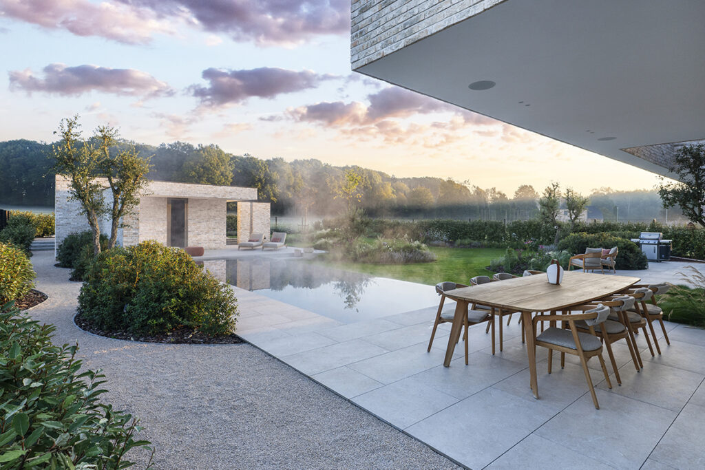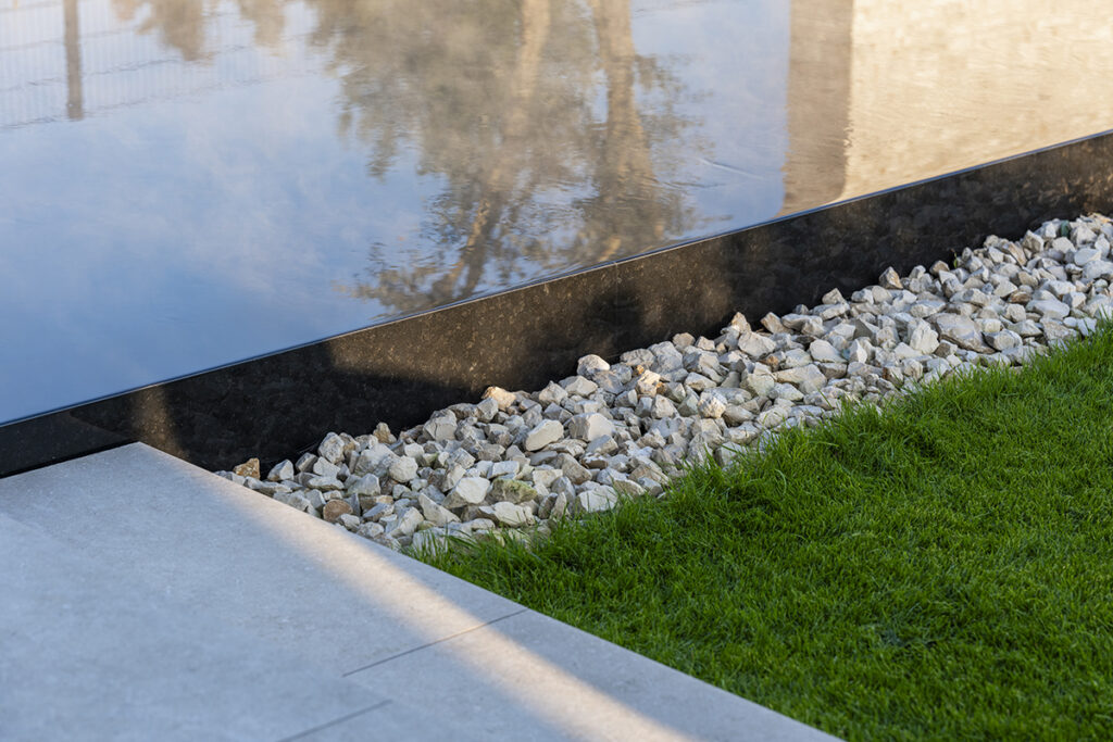 Enigszins opvallend is dat het zwembad niet pal achter de strakke raampartijen van de woning ligt, maar aan de zijkant van de tuin. “De bewoners wilden dat, wanneer ze binnen zijn, het zwembad niet té prominent in het zicht ligt”, verduidelijkt Dieter. Daarnaast slaagt de waterpartij er tevens in om het hoogteverschil in de tuin op een elegante manier weg te werken. De waterlijn ligt net als de terrassen iets hoger dan de rest van de tuin, maar dankzij de strakke overlooprand valt dat nauwelijks op. Wat evenmin opvalt, is de overloopgoot. Die wordt aan het zicht onttrokken met grote kiezels. Het zijn zulke esthetische details die ervoor zorgen dat de tuin- en zwemdroom van de bewoners helemaal is waargemaakt.