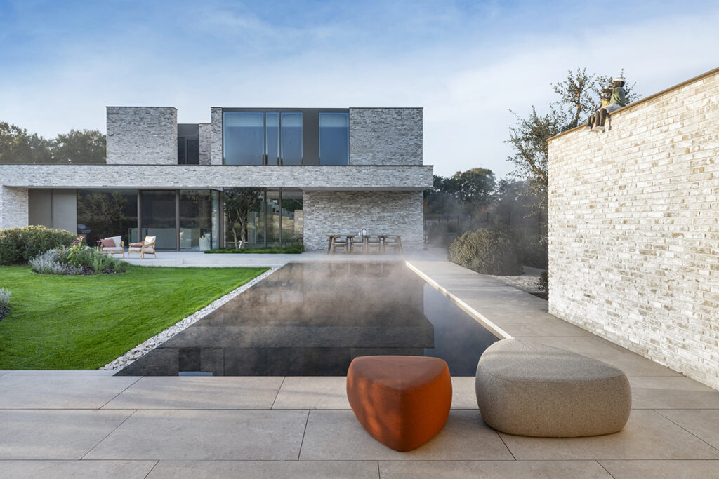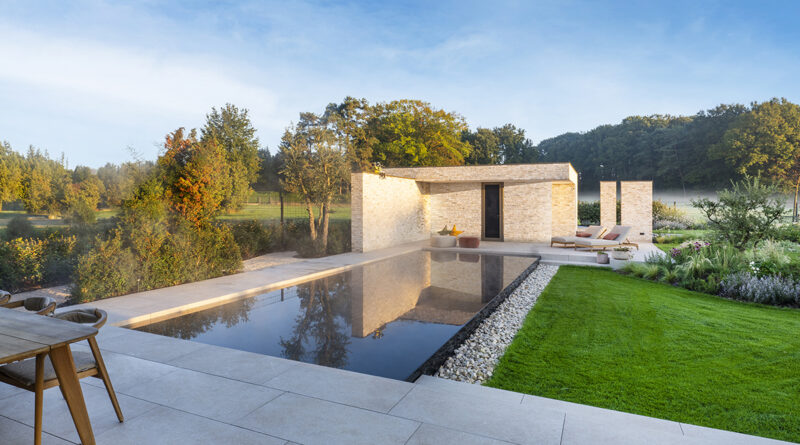 Dankzij de grote ramen aan de achterzijde van de woning lijken binnen en buiten naadloos in elkaar over te lopen. Dat effect wordt alleen nog maar versterkt door de materiaalkeuze. De beige, keramische tegels zijn een visueel verlengstuk van de tegels die binnen liggen en het poolhouse heeft dezelfde strakke vormgeving, gevelafwerking en kleurencombinatie als het huis. Mooi ingekapseld daartussen ligt het op maat gemaakte zwembad, dat dankzij de rand van zwart graniet mooi contrasteert met de beige tinten. De binnenkant van het zwembad kreeg eveneens een zwarte afwerking. “De betonnen wanden, bodem en ingebouwde trap zijn bekleed met een zwarte liner. Die zorgt ervoor dat het water de omgeving maximaal reflecteert en geeft het water een natuurlijk uitzicht”, legt Dieter Valkenborgh van Zwembaden Valkenborgh uit.
